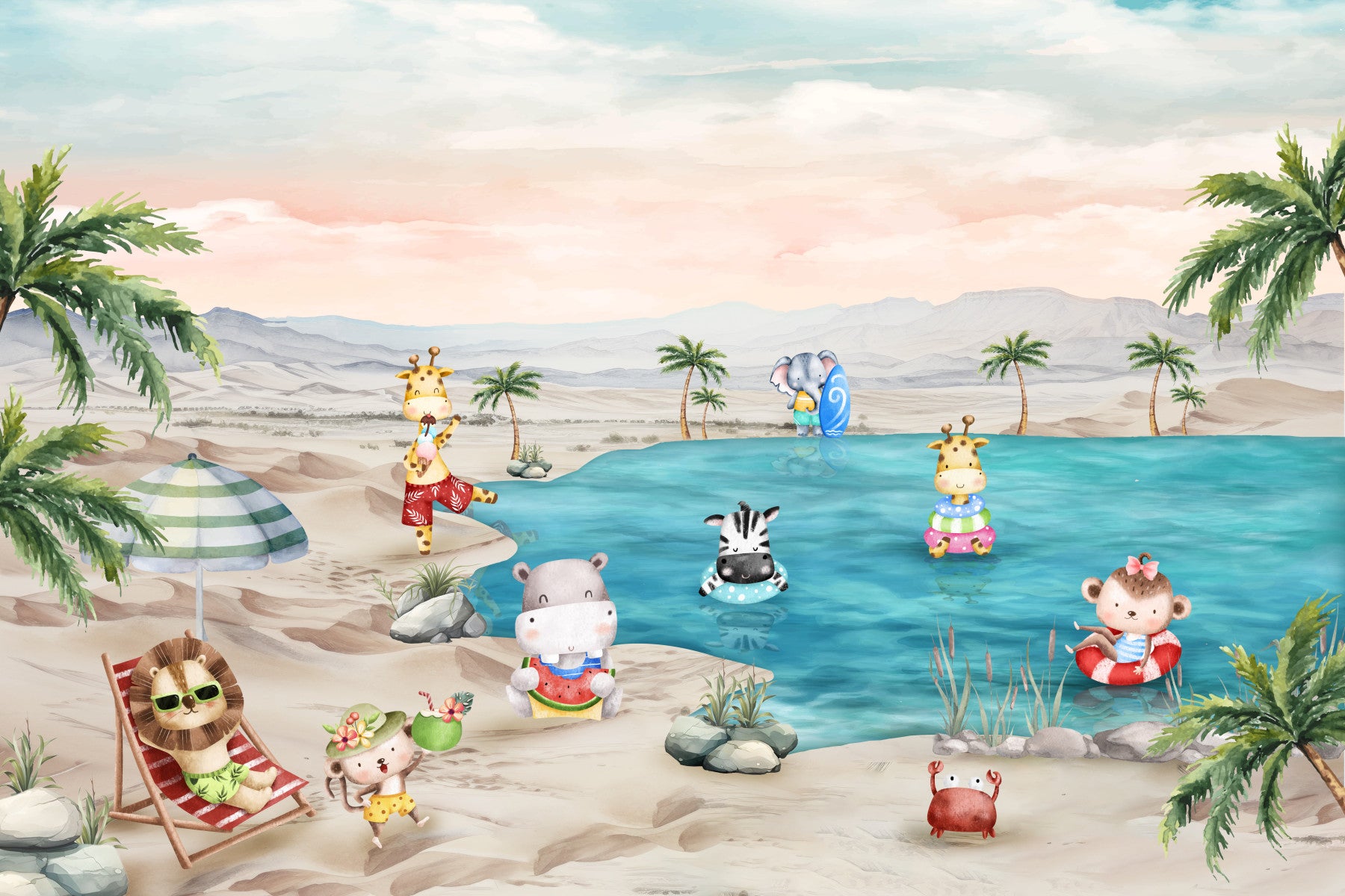Introduce a splash of summer charm to any room with this delightful coastal critter design. Adorable animal characters enjoy beach activities under palm trees, creating a serene and playful vibe. The pastel colors and hand-drawn style make it perfect for a nursery or playroom. This wallpaper for walls fosters a lighthearted atmosphere. The whimsical scene works particularly well in bedrooms, promoting relaxation with its soft tones and engaging characters.
