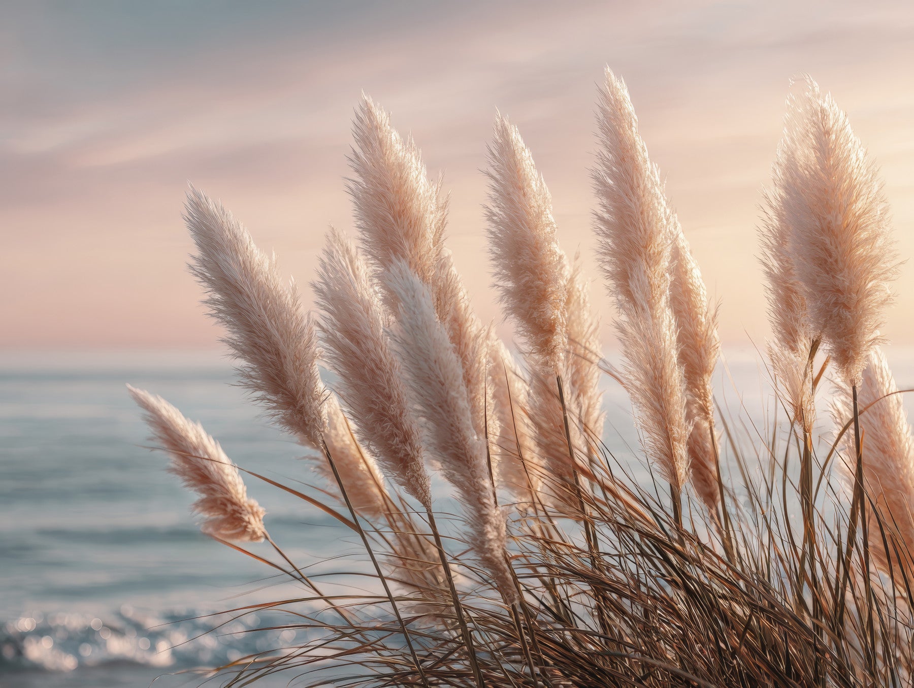 Drift away to a serene coastal haven with this calming wallpaper. Silhouetted against a soft sky, delicate pampas grass plumes create a dreamy foreground to the ocean's gentle shimmer. The subtle color palette of soft pink, beige, and muted blue creates a sense of tranquility and relaxation. This wallpaper is ideal for bedrooms, bathrooms, or any space where you seek a moment of calm. Let the peaceful scenery transport you to the coast, offering a daily escape from the everyday hustle.