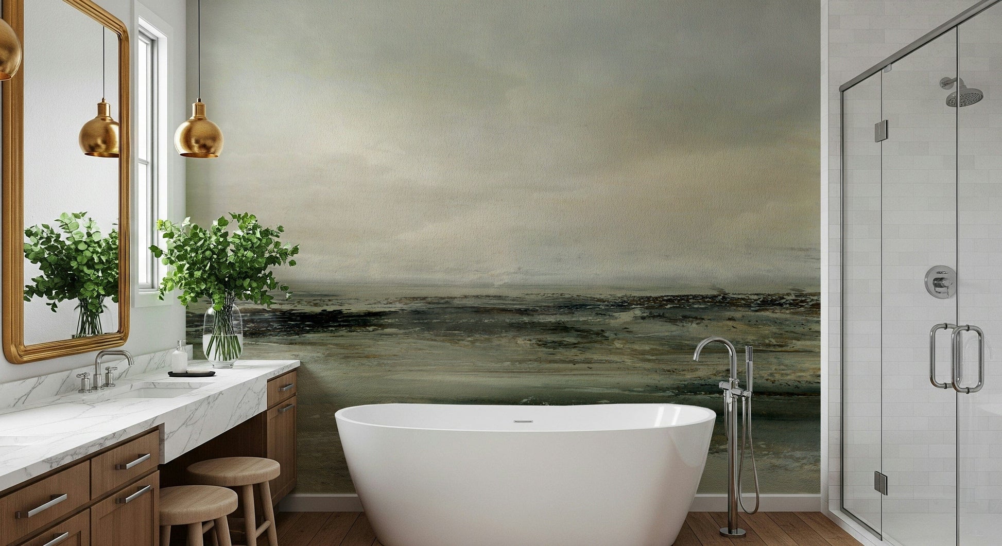 This serene wallpaper features a muted seascape that brings a sense of calm to any room. Earth tones blend to form a tranquil scene, perfect for spaces where relaxation is key. The gentle colours and abstract design make this wallpaper for walls a versatile choice. Its painterly effect works well in a living room or bedroom. The design complements interiors that lean towards a minimalist, modern, or even rustic aesthetic. It invites a peaceful atmosphere.