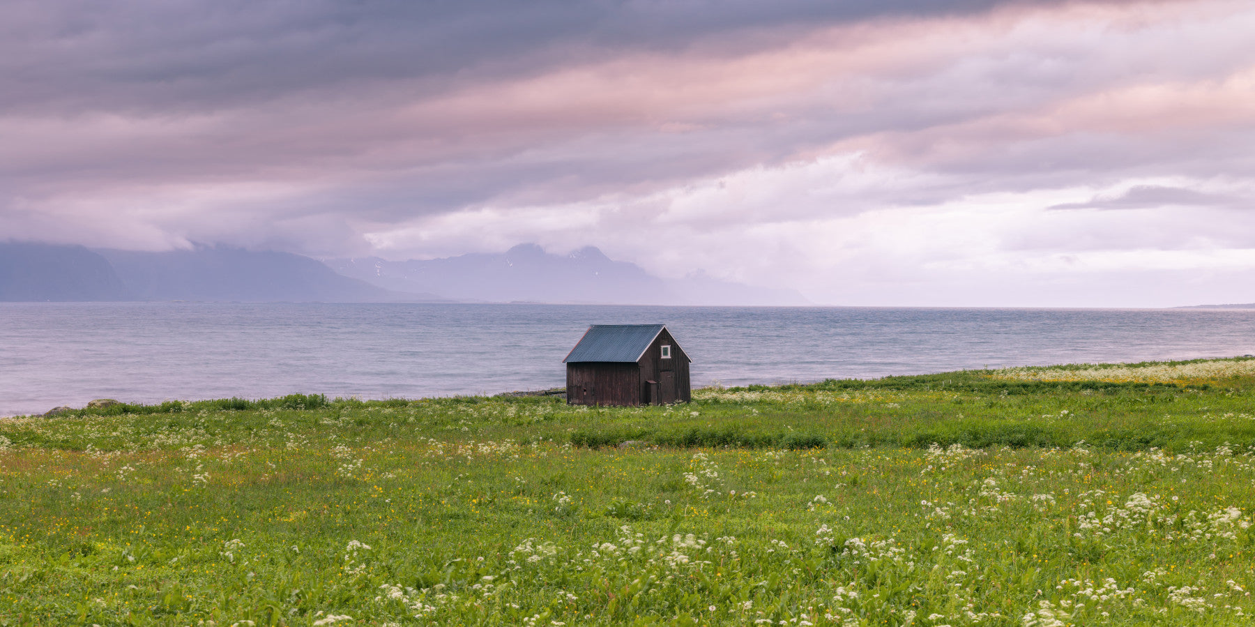 Beach hut on Lofoten coastline, Norway. Escape to a serene coastal landscape with this captivating wallpaper. A quaint, dark brown shed stands solitary amidst a vibrant green meadow bursting with wildflowers, set against the backdrop of a calm sea and distant, misty mountains. The soft, pastel-hued sky evokes a sense of tranquility and peaceful isolation. This wallpaper captures the essence of untouched natural beauty, perfect for creating a calming and serene atmosphere in any room, especially as a backdrop for a study or bedroom.
