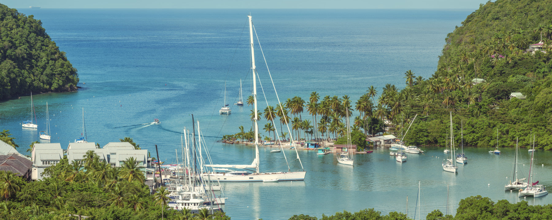 Marina bay with sailing boats in St Lucia. Experience the ultimate coastal escape with this stunning wallpaper. It showcases a picturesque harbor nestled between lush, tropical hillsides. The vibrant turquoise water is dotted with elegant sailboats, creating a sense of tranquility and serenity. Palm trees sway gently in the breeze, adding to the idyllic ambiance. The image's high resolution captures every detail, making it perfect for transforming any space into a peaceful coastal retreat. Feel the warm sun and gentle sea breeze with this mesmerizing wallpaper that brings the beauty of the tropics into your home.