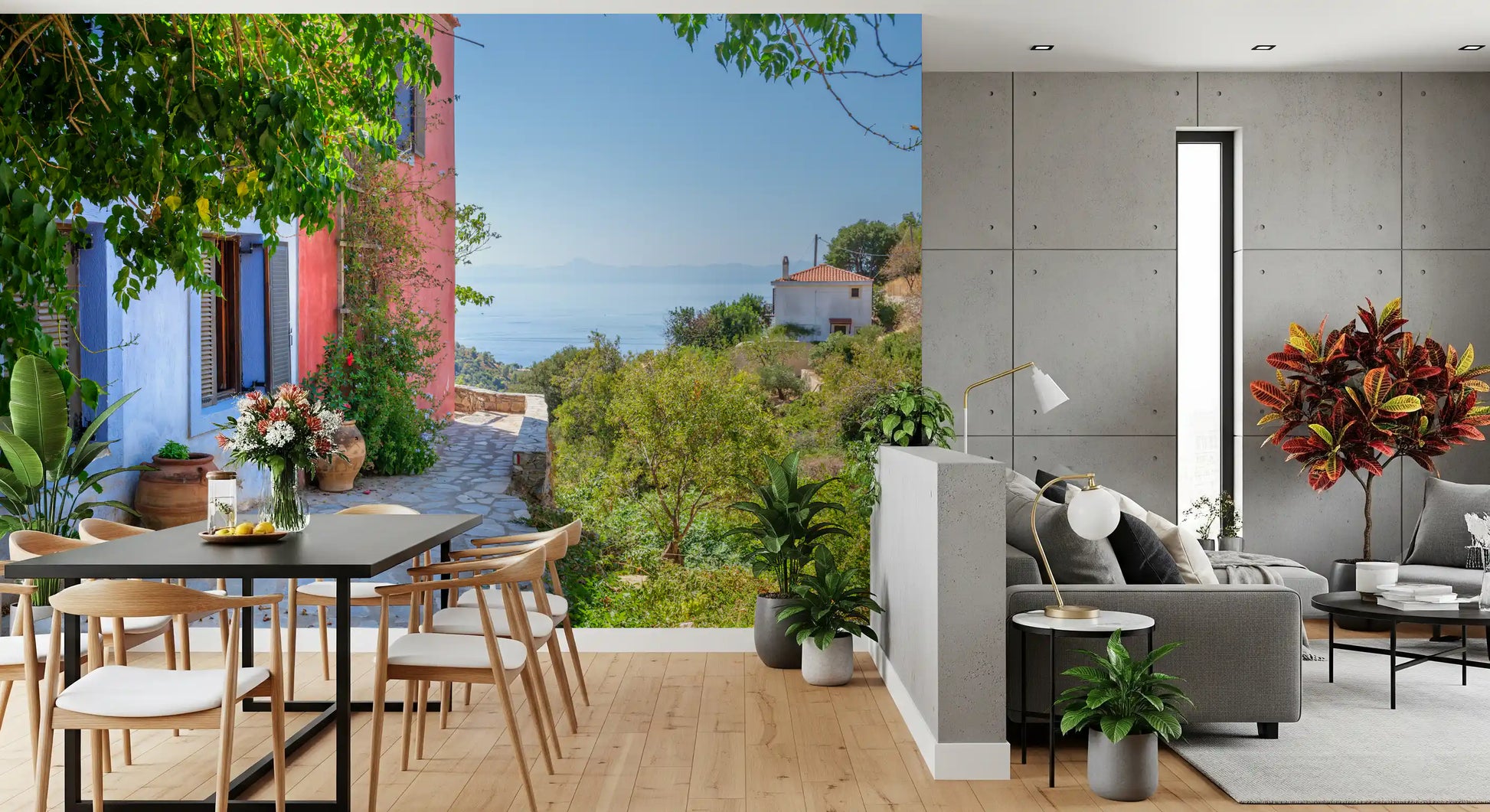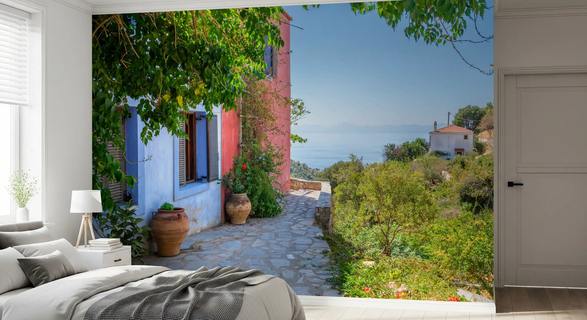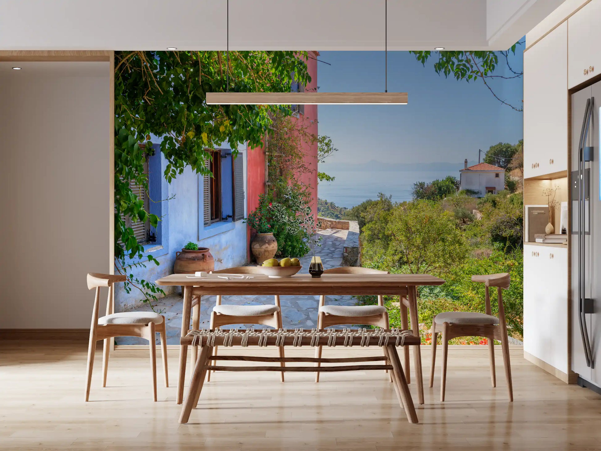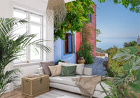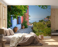 Evoke the spirit of the Mediterranean with this scenic coastal wallpaper. This wallpaper for walls captures a charming stone pathway winding through sun-kissed buildings. Notice the light blues and soft corals contrast with vibrant greenery. The design transports you to a tranquil seaside village, perfect for bringing a calming, vacation ambiance to any room. This wallpaper's muted tones work beautifully in bedrooms, living rooms, or hallways. It will enhance the character of modern, classic, or boho decors and will create a bright and airy space. The subtle patterns and colors add depth without overwhelming, complementing your interior design.