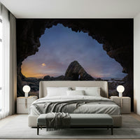 Bring the drama of the seashore indoors with this stunning wallpaper for walls. Gaze through a natural archway toward a rocky outcrop silhouetted against a twilight sky. The cool blues and purples of the sky blend with the textured dark greys and browns of the rock formations, creating a sophisticated, moody ambiance. It's an excellent choice for living rooms, bedrooms, or home offices where you want to evoke a sense of tranquillity and wonder. This wall decor complements modern, rustic, or minimalist interiors.