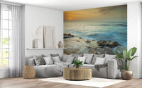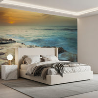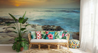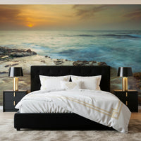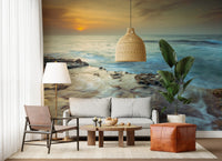 Sunset over Palmachim beach, Israel. Bathe your space in the ethereal glow of 'Coastal Radiance'. This design captures the serene beauty of the shoreline at the cusp of dawn. The soft, blurred movement of the water evokes a sense of tranquility and peace. Warm hues from the sun’s nascent light spill across the horizon, reflecting off the rugged, moss-kissed rocks that stand firm against the gentle tide. Imagine the subtle sounds of the sea as it caresses the shore, the air thick with salty mist. Elevate any room with this image, creating a sanctuary of calm and natural beauty, as warm, inviting light dances across your walls.