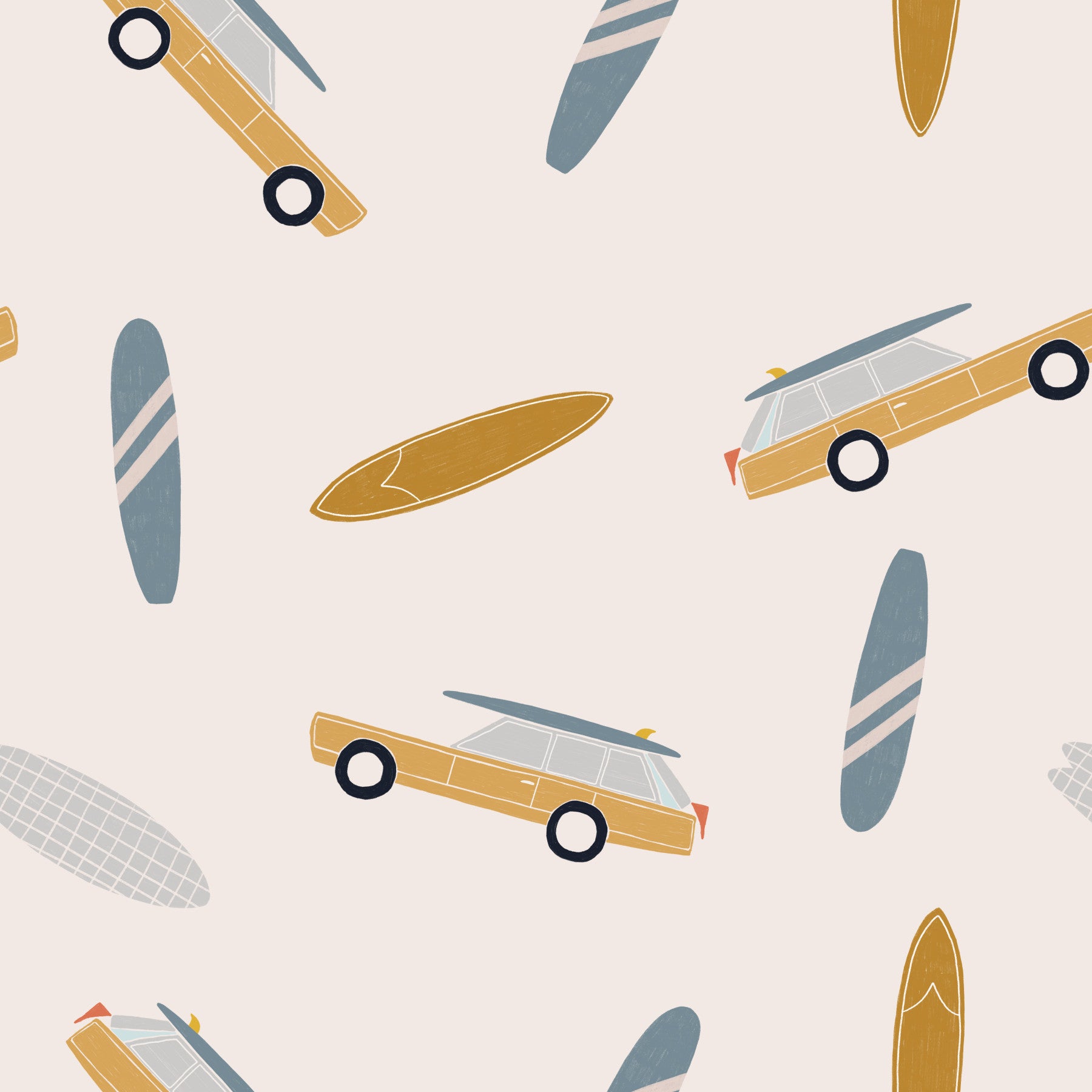 Soft-toned wallpaper filled with whimsical surfboards and tiny illustrated vans inspired by beach travel.