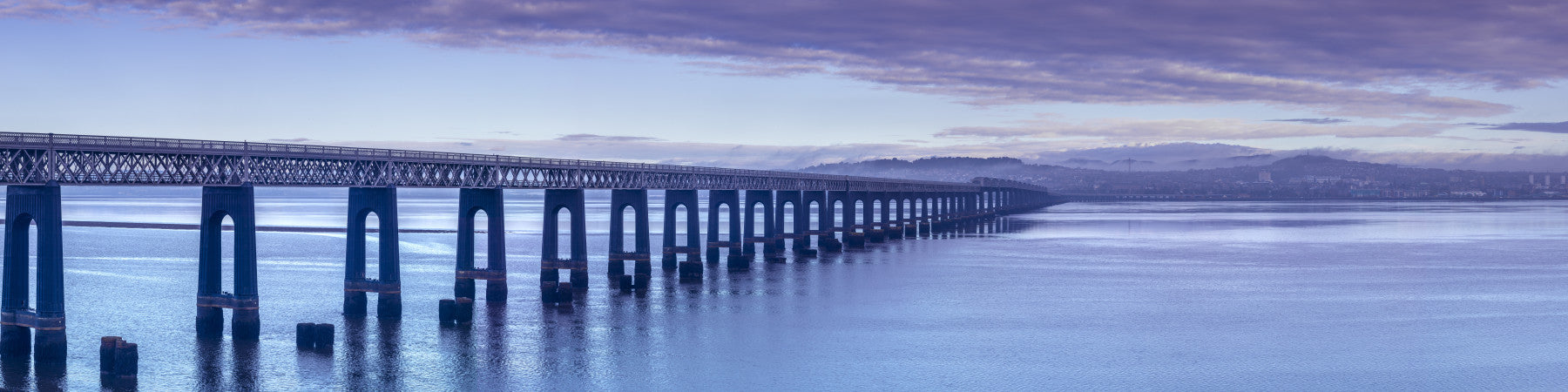 Tay Rail Bridge, Dundee, Scotland. Transform your space with this breathtaking wallpaper for walls. The image features a bridge extending over cool blue waters under a soft, tranquil sky. Gentle hues of blue and purple bring a sense of calm and serenity to any room. Perfect for living rooms, bedrooms, or offices, this design complements various interior styles, from modern to traditional. The linear structure of the bridge adds depth and dimension to your space, while the water creates a peaceful atmosphere. Bring this calming scene into your home!