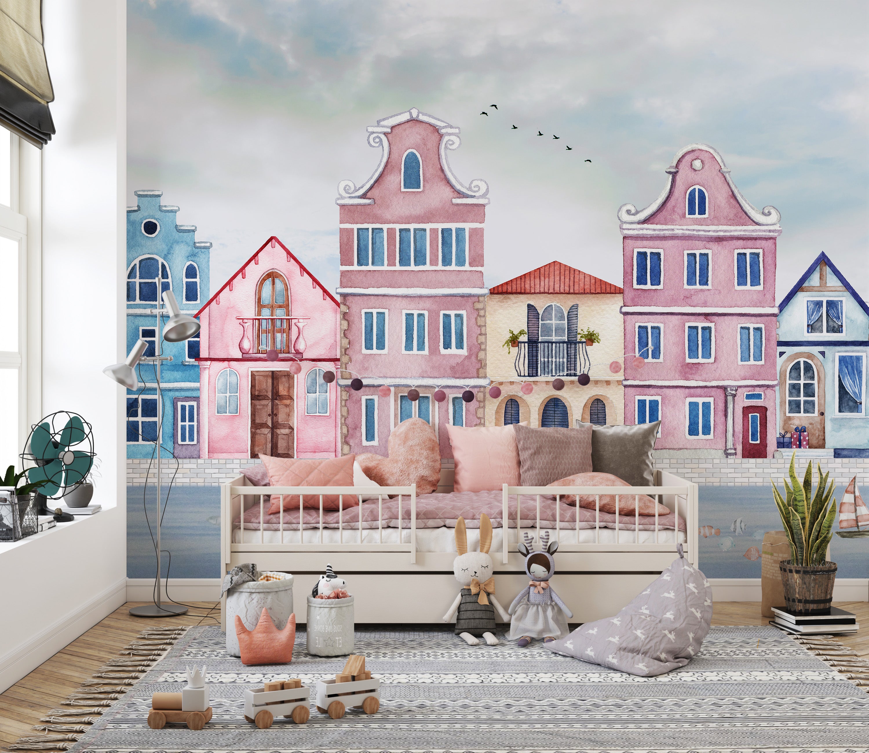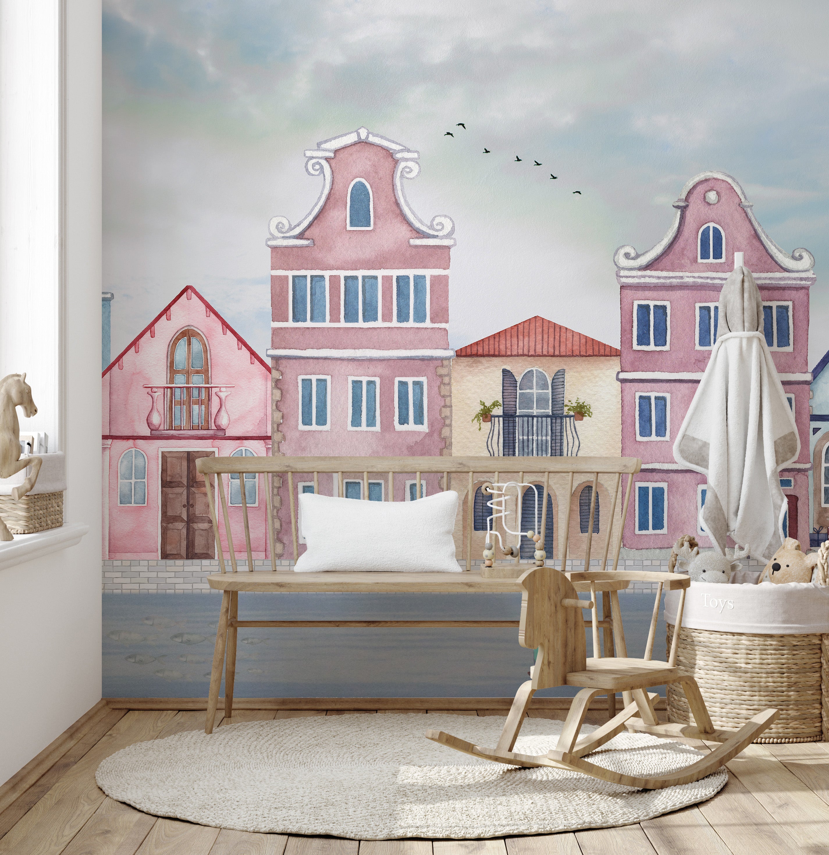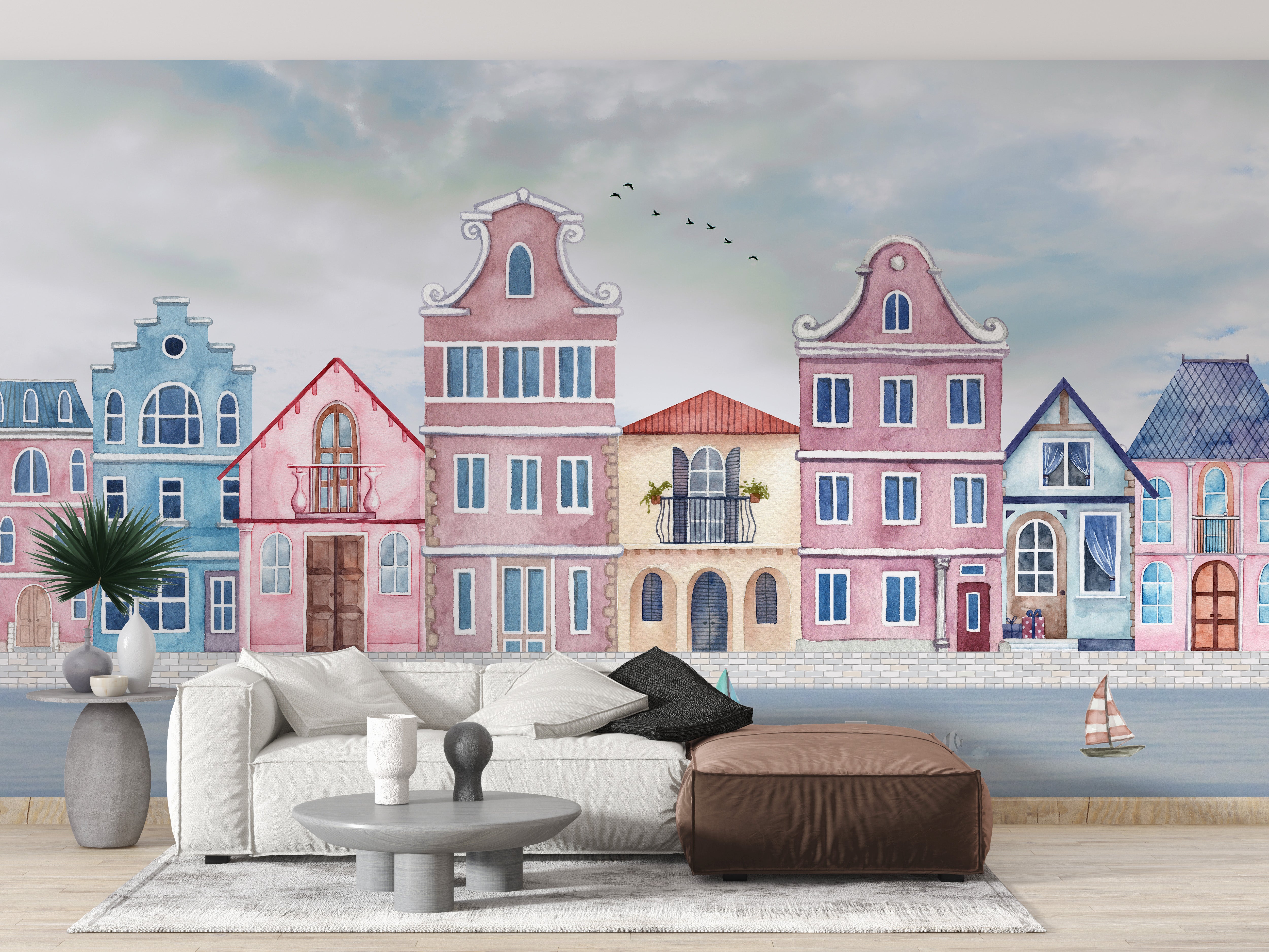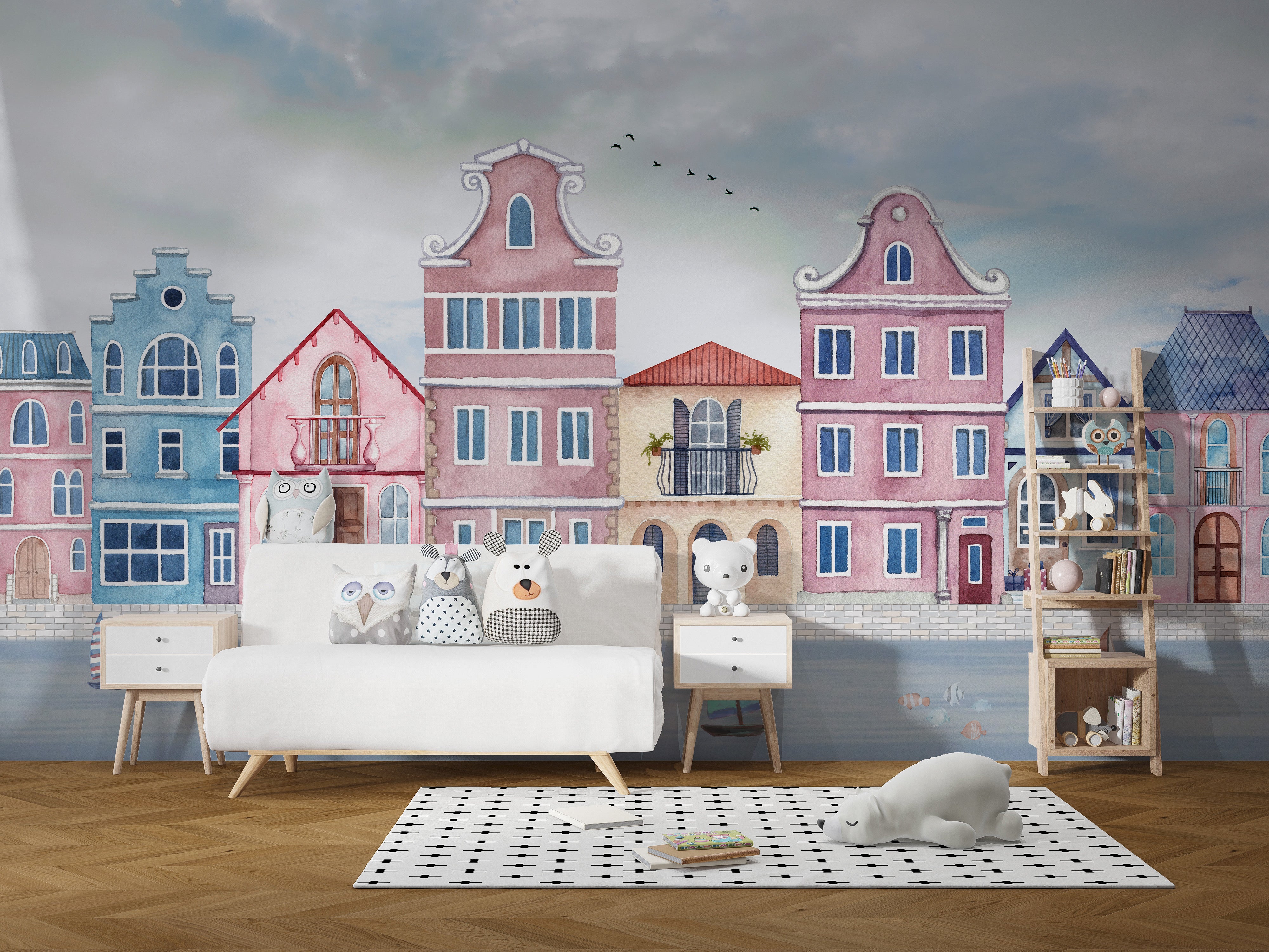 Unique watercolor coastal town wallpaper for kids