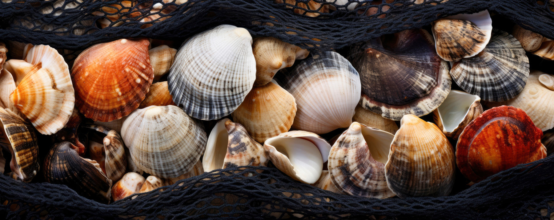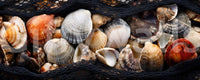 Dive into the serene beauty of the ocean with "Coastal Treasures". This captivating wallpaper showcases a collection of exquisite seashells, carefully gathered and elegantly arranged. The intricate patterns and warm, earthy tones of the shells evoke a sense of tranquility and natural wonder. Drapped across the shells is a rustic black fishing net, adding a touch of seafaring charm and texture to the composition. Each shell tells a silent story of the sea, its unique form and colour shaped by the ebb and flow of tides. This wallpaper brings a touch of the coast's timeless elegance to your digital space, offering a calming and visually stimulating experience that celebrates the simple yet stunning treasures found along the shoreline. It's a perfect way to bring the ocean's harmony and artistry into your everyday life.