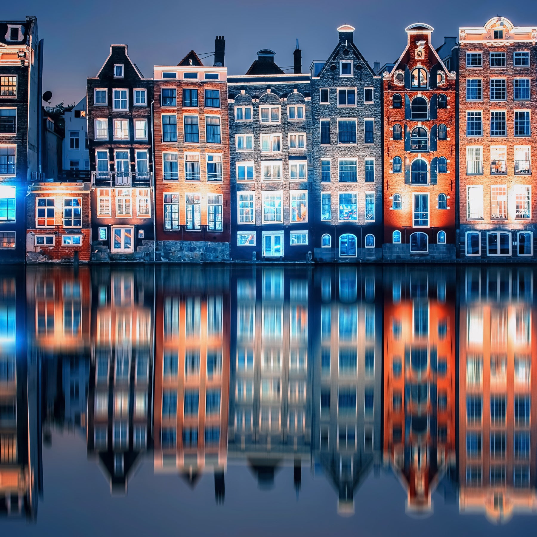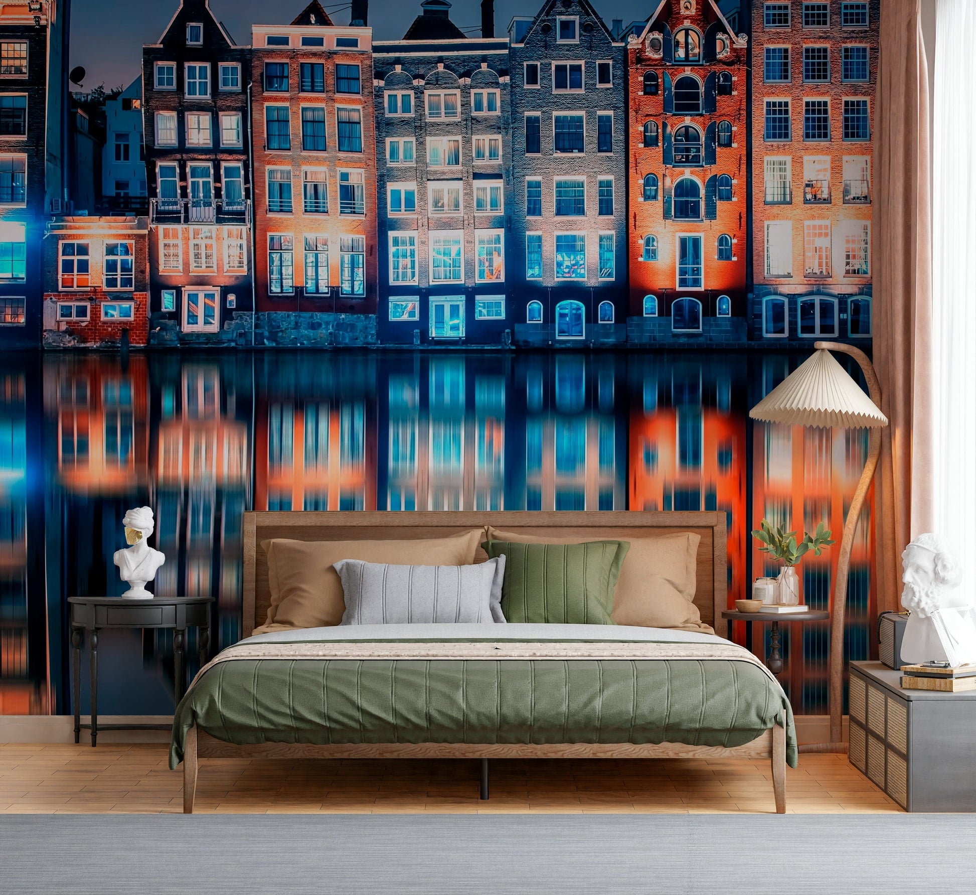 Bring the charm of Amsterdam’s canals to your space with this captivating wallpaper for walls. The design showcases the city's iconic houses, lit with warm, inviting light, mirrored in the tranquil waters. The colour palette centres on deep blues and rich oranges, creating a dramatic yet calming effect. This wall décor works beautifully in living rooms, dining areas, or hallways, adding sophistication and a touch of global flair. Imagine this vibrant scene enhancing the atmosphere of your home, transforming any room into a cosy and picturesque haven.