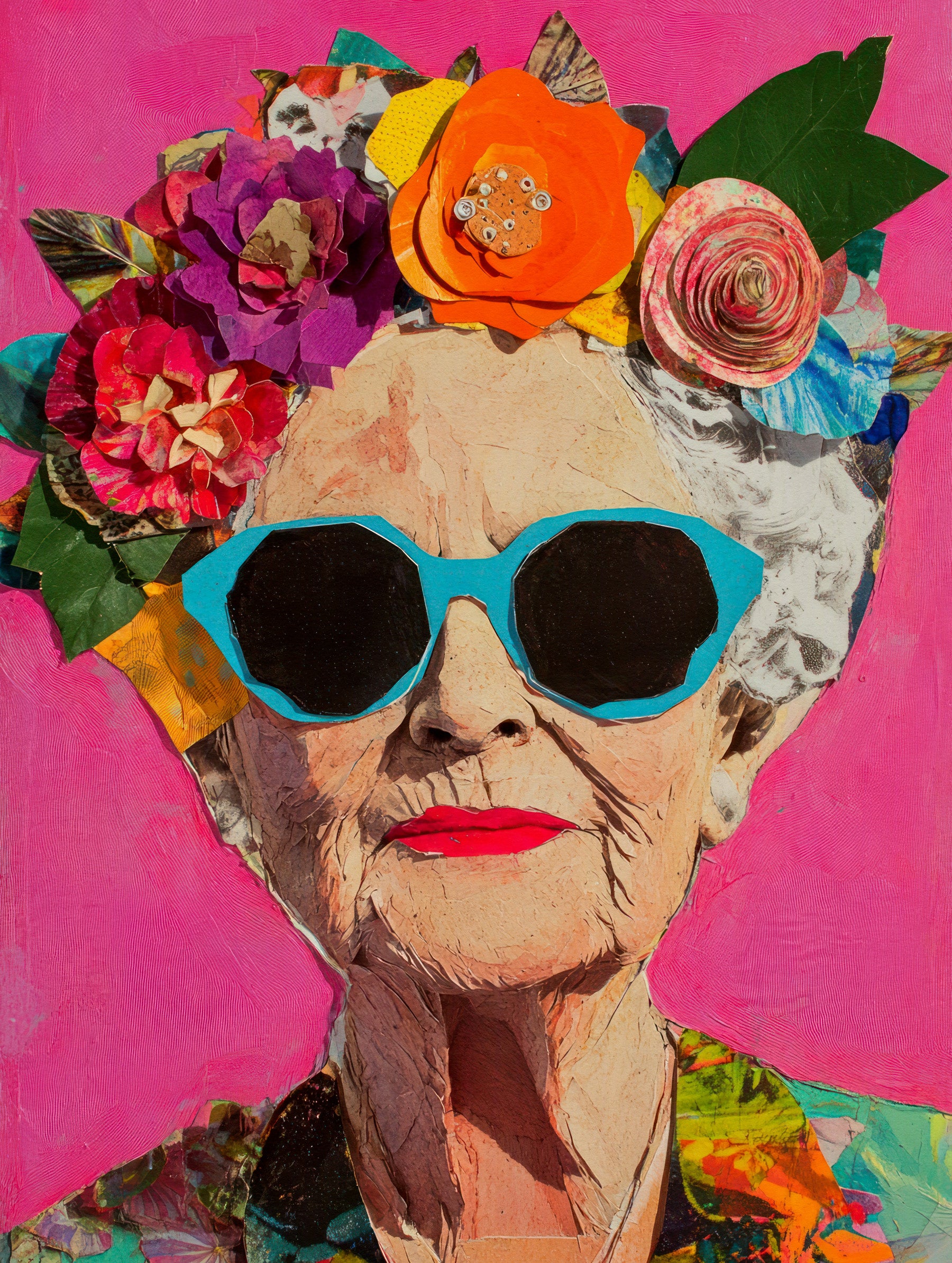 A bold and vibrant portrait of a stylish elderly woman wearing oversized turquoise sunglasses and a crown of layered paper flowers in vivid colours. Set against a hot pink background, this mixed-media artwork radiates confidence, joy, and individuality. The textured collage style gives depth and dimension, blending contemporary pop art energy with expressive handmade charm. Perfect for modern interiors, eclectic walls, and spaces seeking a lively conversation piece full of personality and colour.