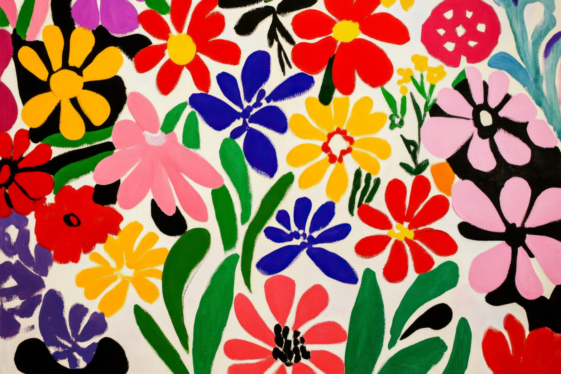 Immerse yourself in a vibrant floral fantasy with this stunning wallpaper. Inspired by Henri Matisse's bold use of color and the clean lines of 1950s modernist art, this piece bursts with simplified, yet striking blooms. Vivid reds, yellows, blues, pinks and purples interplay with lush green foliage, creating a cheerful and energetic mood. Black accents provide graphic contrast, emphasizing the organic forms and adding a touch of mid-century sophistication. The flat, graphic style evokes a playful, retro aesthetic, perfect for adding a splash of color and artistic flair to any space.