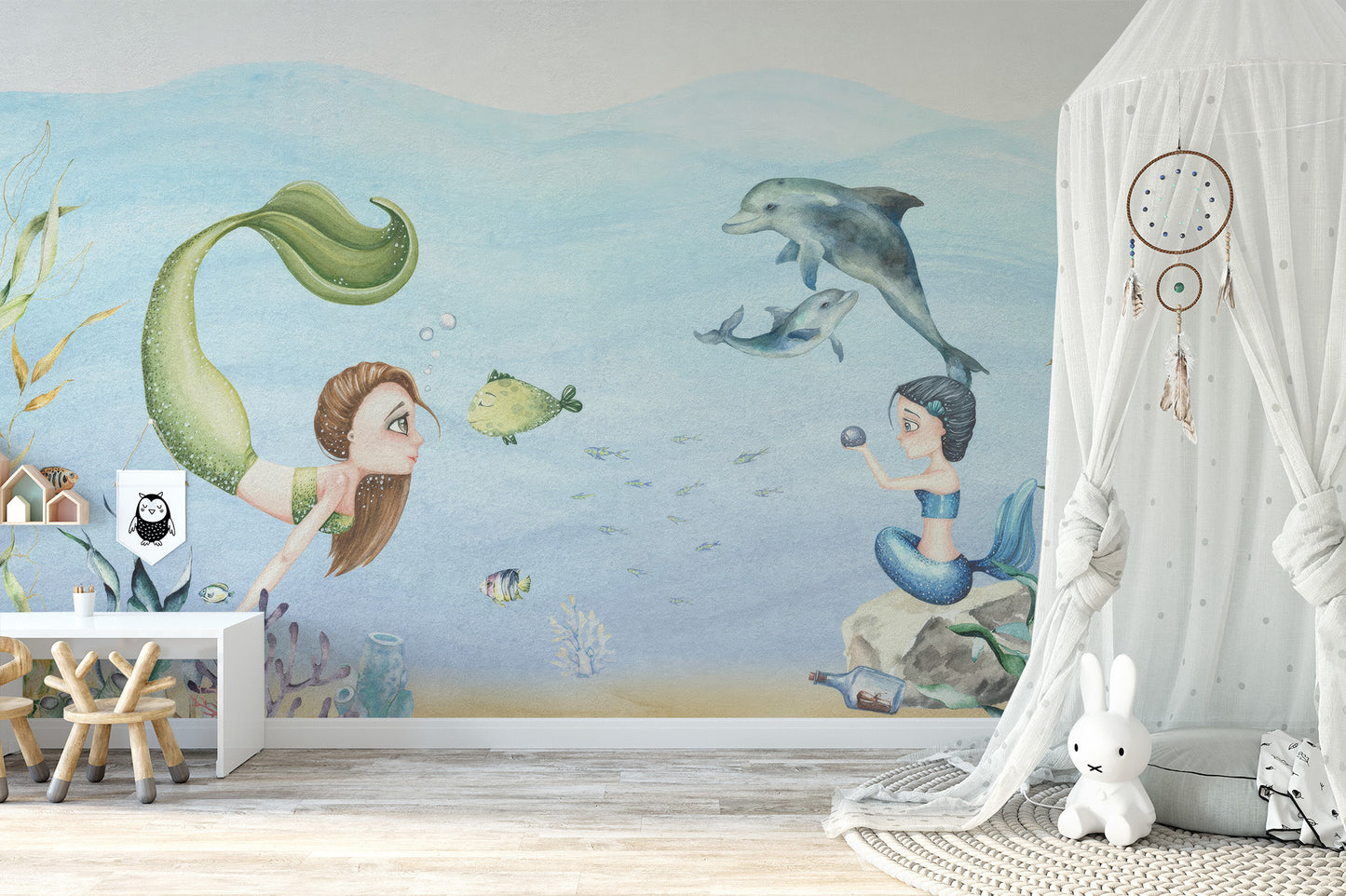 Create a magical underwater world in your girls room with the colorful mermaids wallpaper mural. This mural features enchanting mermaids, playful dolphins, and vibrant marine life that captivate the imagination. The delightful scene encourages creativity and play, making it perfect for a child's space. The high-quality material ensures durability and easy application, allowing you to create a stunning feature wall effortlessly. Bring joy and wonder to your child's room with this charming mural. Invest in the Colourful Mermaids Wallpaper Mural for a whimsical touch that inspires endless adventures and transforms any room into a playful haven.