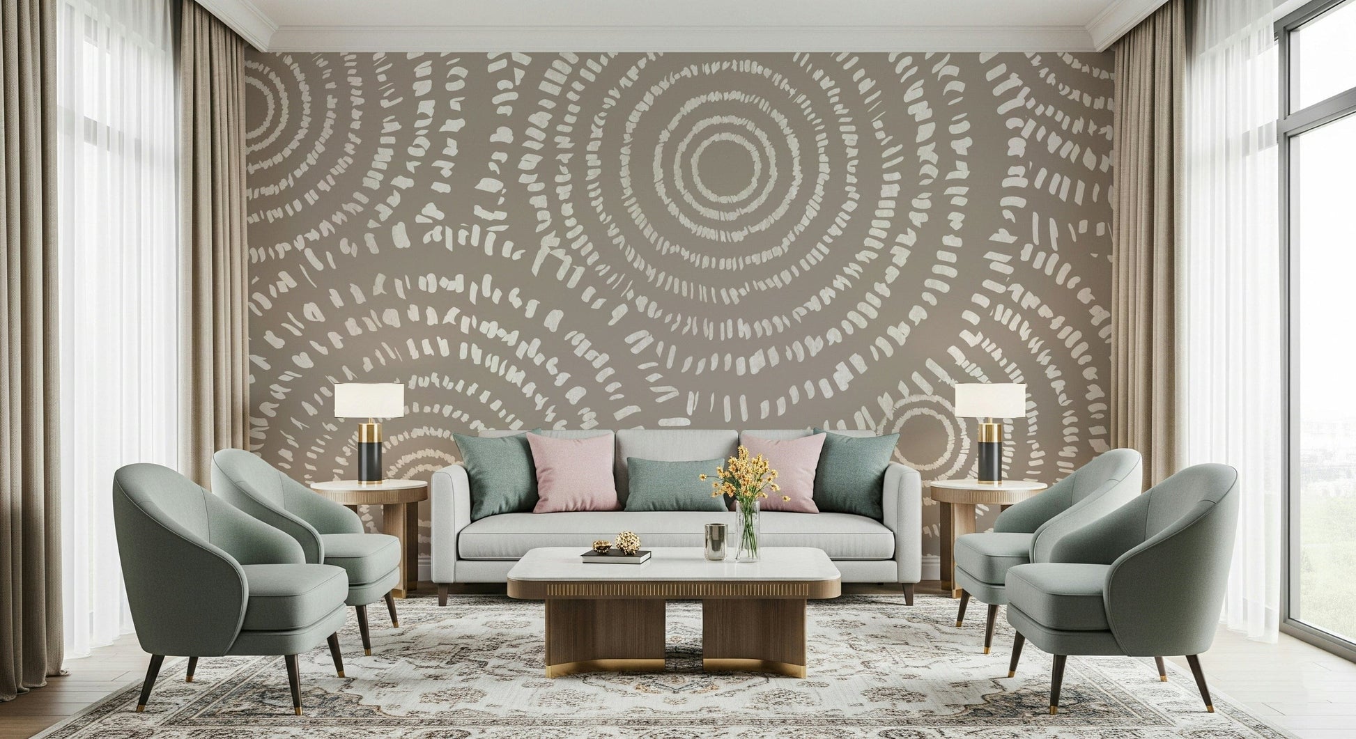 Embrace the subtle rhythm of this concentric circle design. Light, off-white dashes playfully swirl against a soft taupe backdrop, creating a calming, organic feel. This wallpaper for walls brings a touch of understated elegance to any space. Use it to enhance living rooms, bedrooms, or even hallways. Its muted tones and fluid pattern easily integrate into modern, minimalist, or boho-chic interiors, promoting a serene and inviting atmosphere.