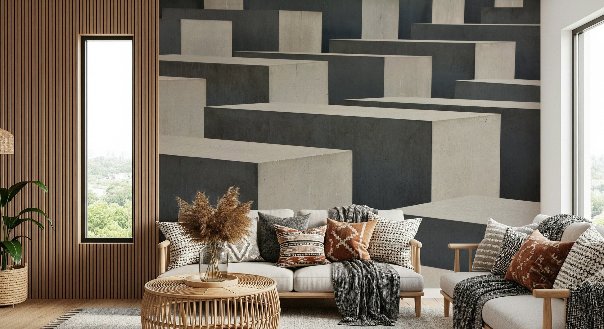 Explore a world of modern art with this captivating geometric design. The concrete blocks create an abstract landscape that plays with light and shadow. This wallpaper for walls works well in minimalist living rooms, industrial-style offices, or a contemporary hallway. The neutral grey tones blend into your home, while the strong lines give a bold touch. Add depth and dimension to your space.