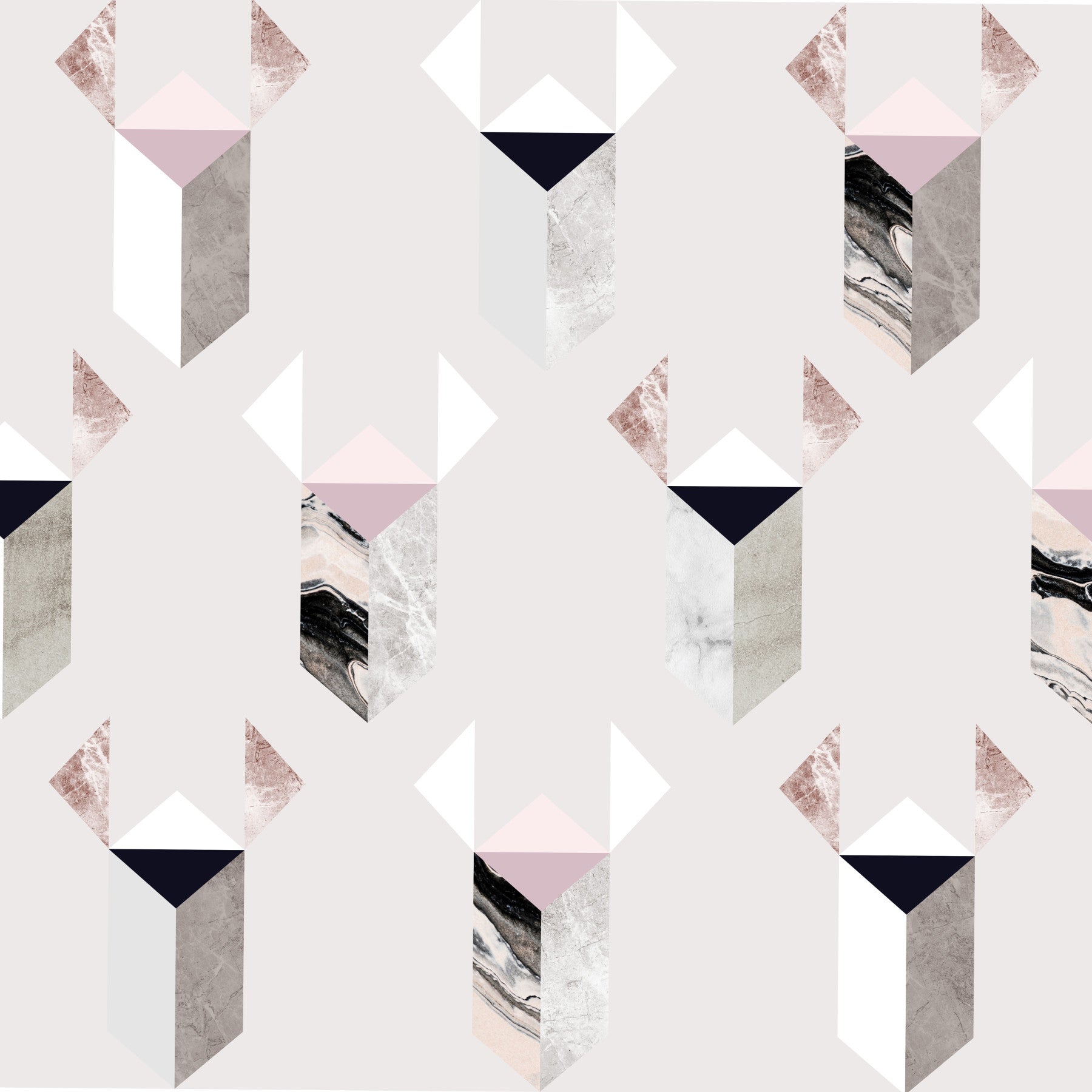 Experience the sleek sophistication of Concrete Neo, a digital wallpaper that seamlessly blends geometric precision with organic textures. A repeating pattern of isometric shapes, rendered in cool greys, soft pinks, and dramatic marble effects, creates a visually arresting composition. Rose gold accents add a touch of subtle luxury, enhancing the modern minimalist aesthetic. This wallpaper offers a tranquil yet stylish backdrop for your digital devices, embodying the perfect balance of raw concrete and neo-modern design.