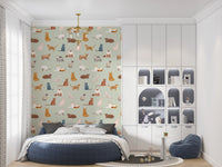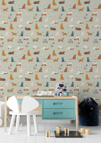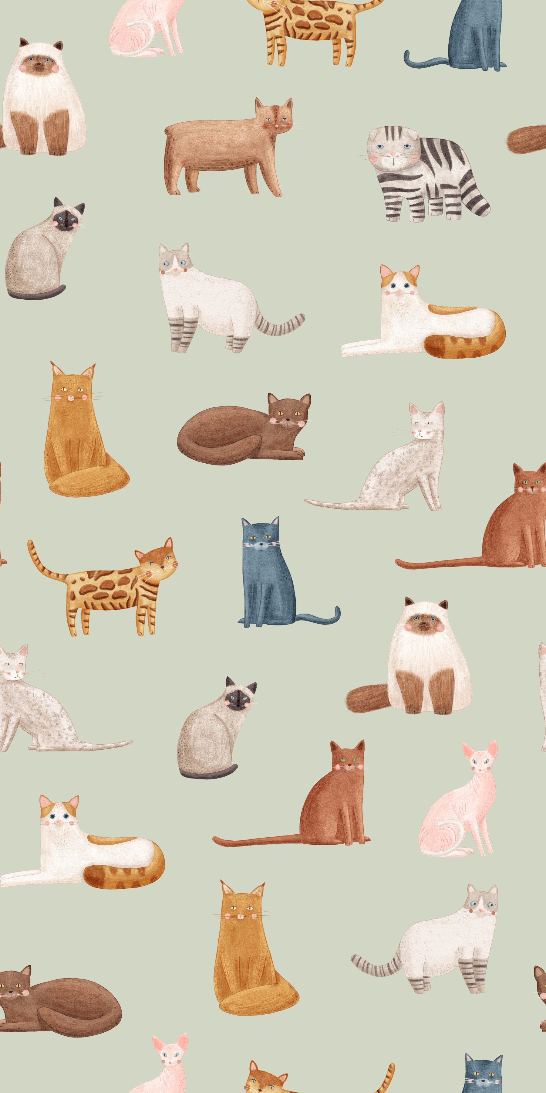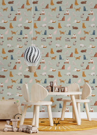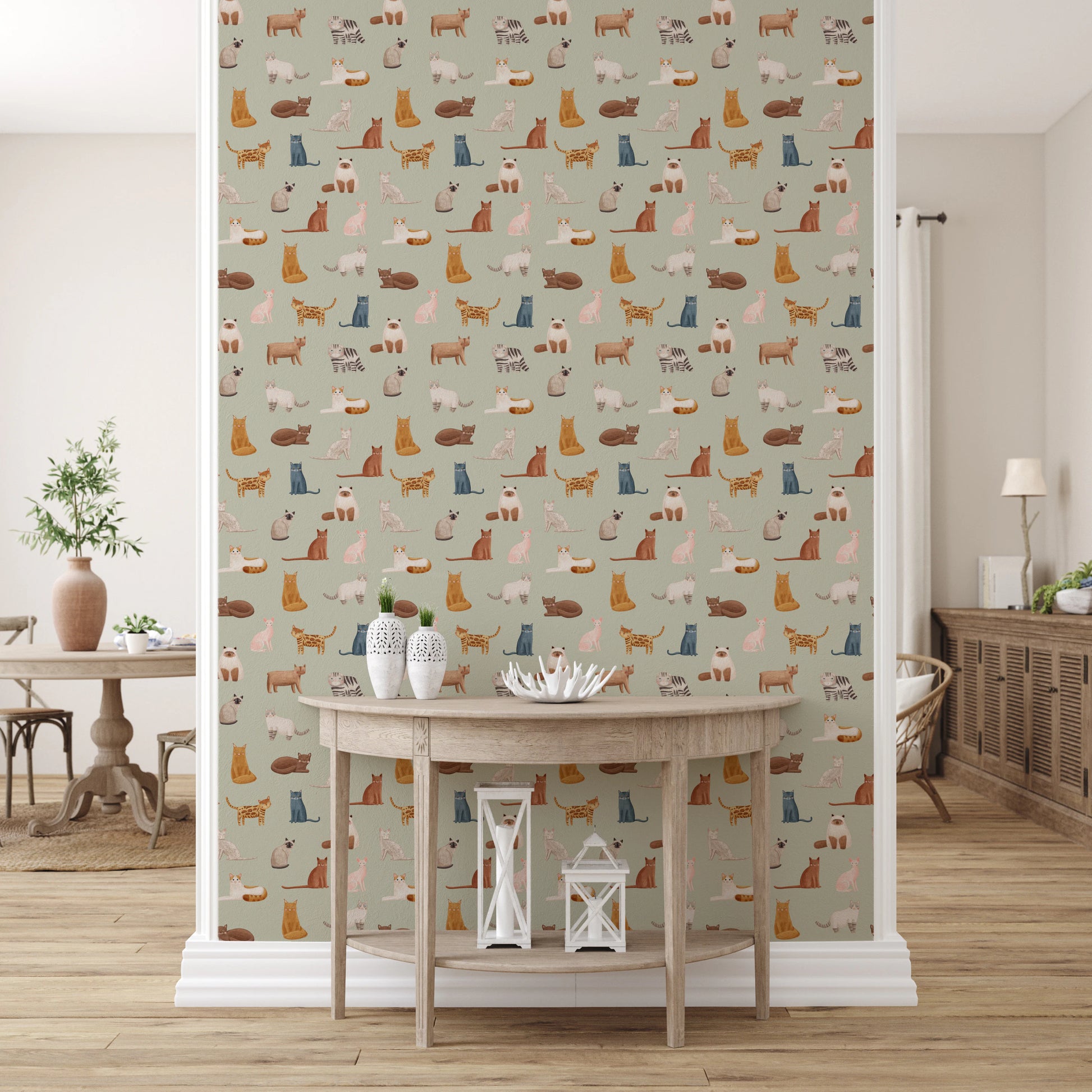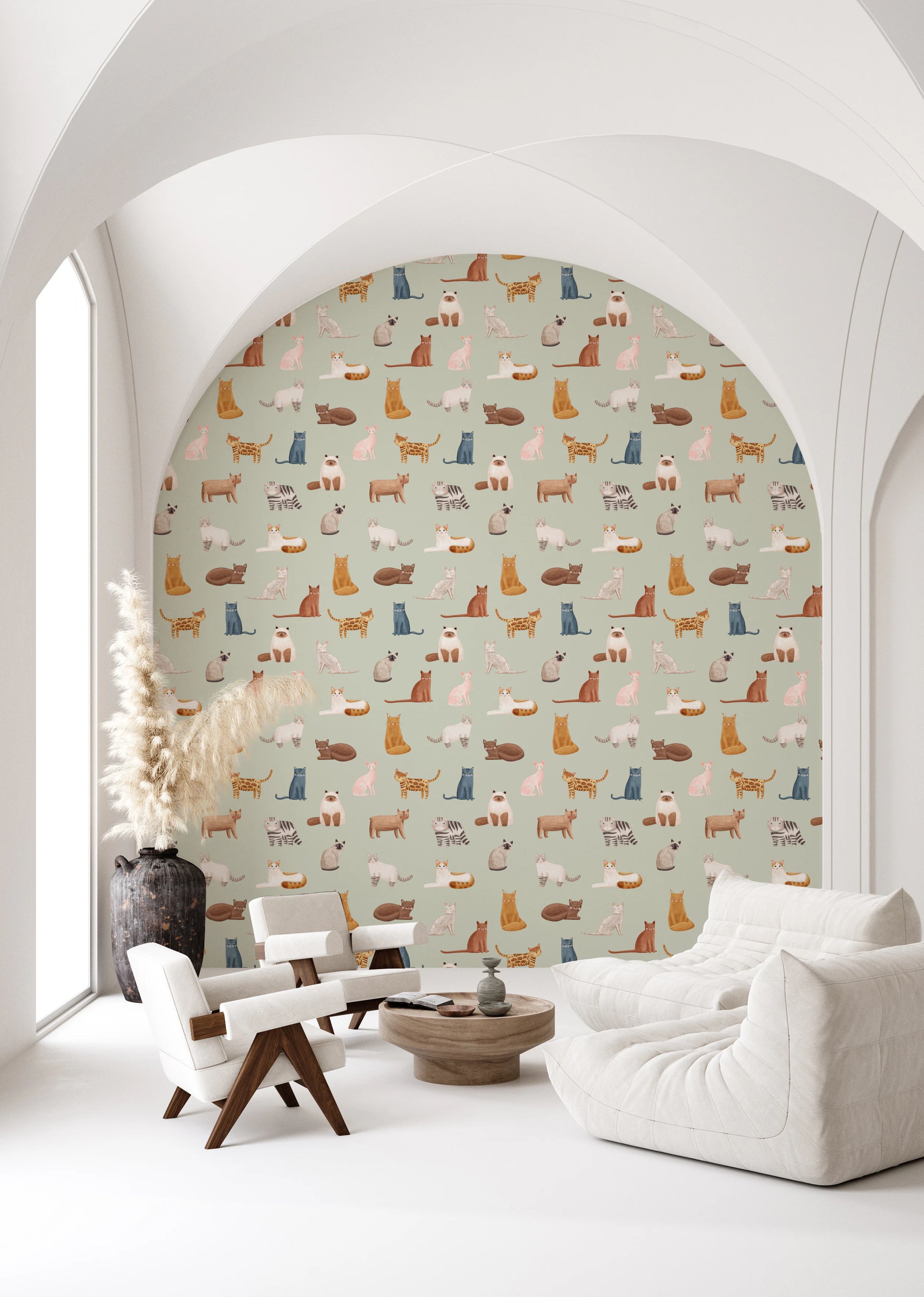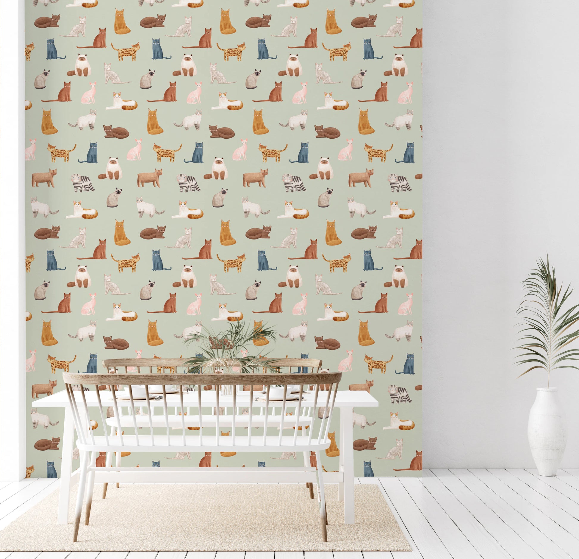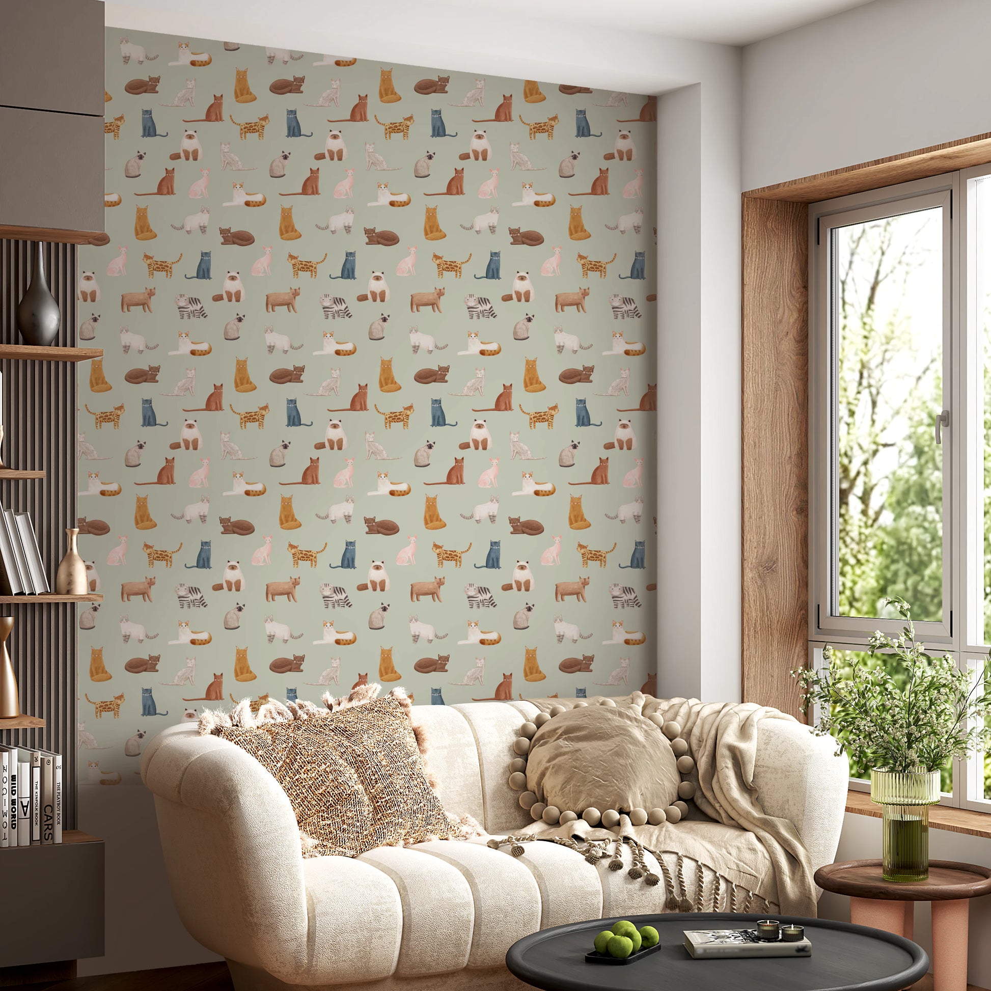 Transform your walls with this playful cat-themed wallpaper. The design features an assortment of charming feline illustrations in a variety of breeds and poses. Warm browns, cool blues, soft pinks, and shades of white contrast beautifully against a gentle green backdrop. This versatile colour palette complements various interior styles. Install this wallpaper for walls in a kid's bedroom or playroom. It adds a touch of whimsy to living rooms, hallways, and even bathrooms. The detailed cat drawings bring personality and visual interest to any space, creating an inviting atmosphere.