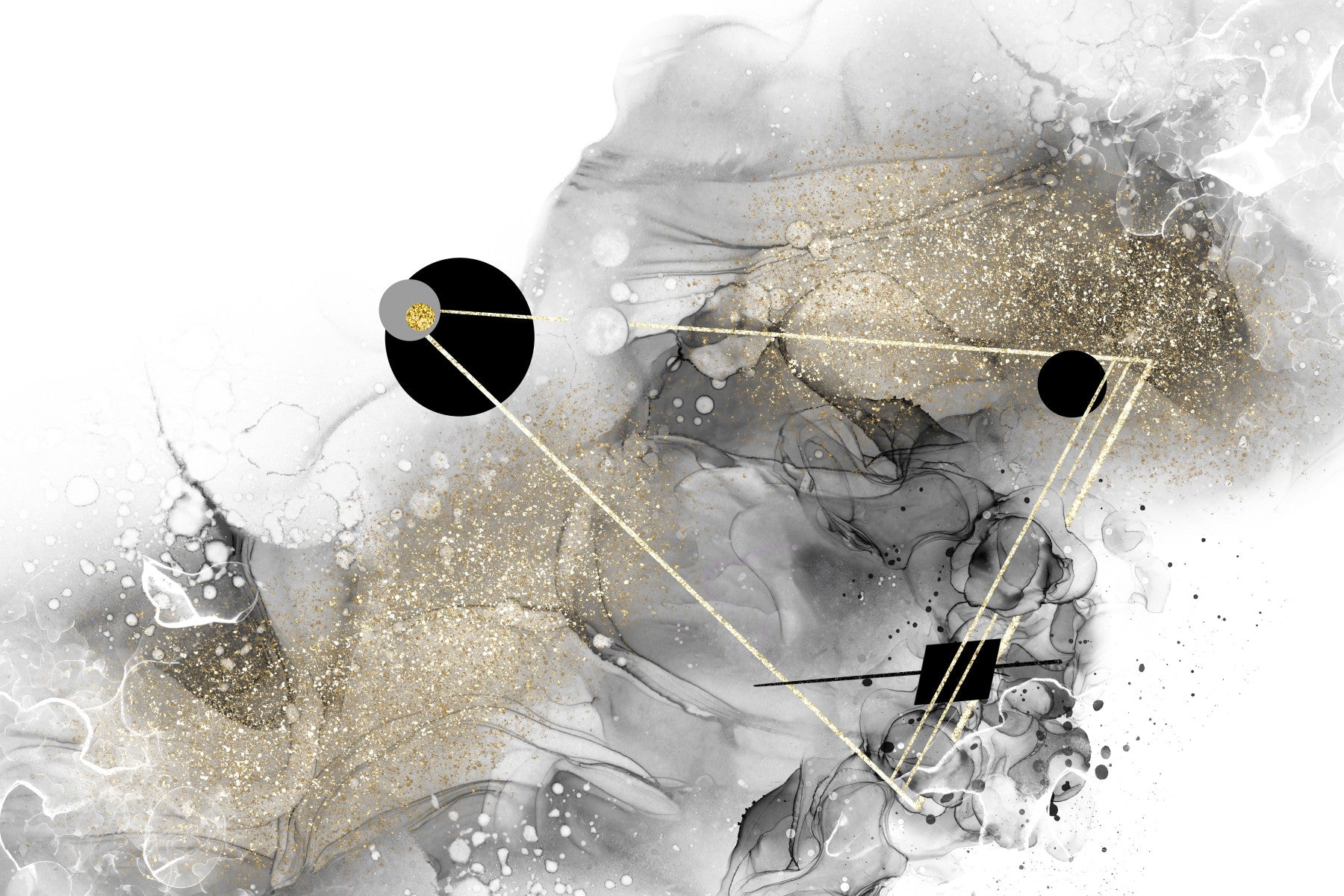 This wallpaper evokes a sense of celestial wonder. The swirling greys and blacks resemble nebulae, while the gold glitter sparkles like distant stars. The geometric lines suggest constellations or celestial pathways, adding a structured element to the cosmic theme. The overall mood is dreamy, mysterious, and inviting, perfect for creating a calming and imaginative atmosphere.