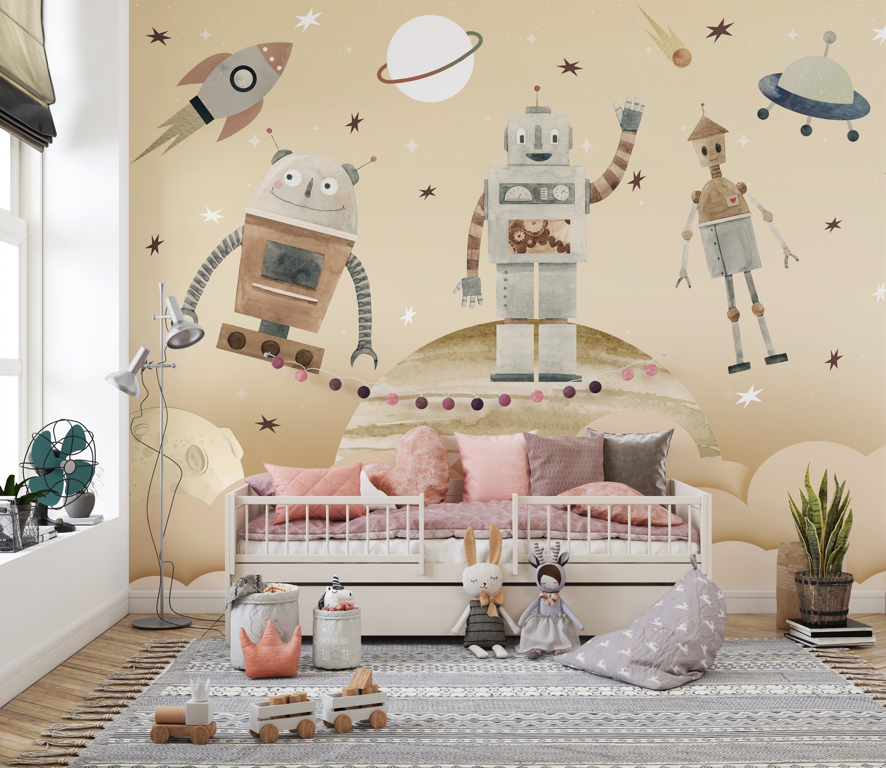 Explore the universe alongside mechanical companions! Our cosmic robots wall mural presents a playful galaxy where whimsy meets exploration. Perfect for sparking young imaginations, this kids space wallpaper showcases friendly robots in cosmic adventures. Each illustrated bot promises new stories of interstellar journeys, encouraging creative play. Launch a room's look to celestial heights no rockets needed, just imagination fueled by our captivating design.