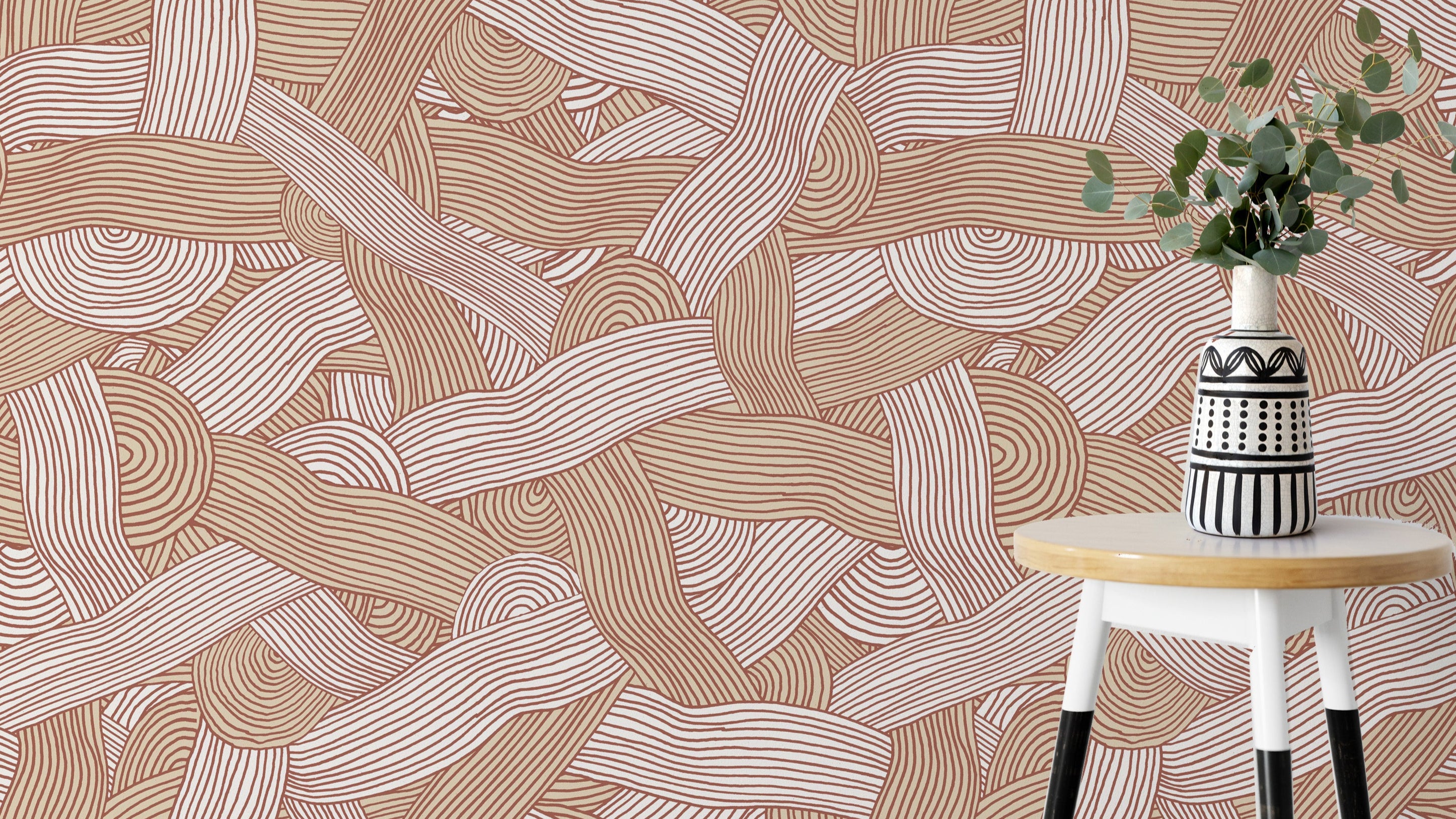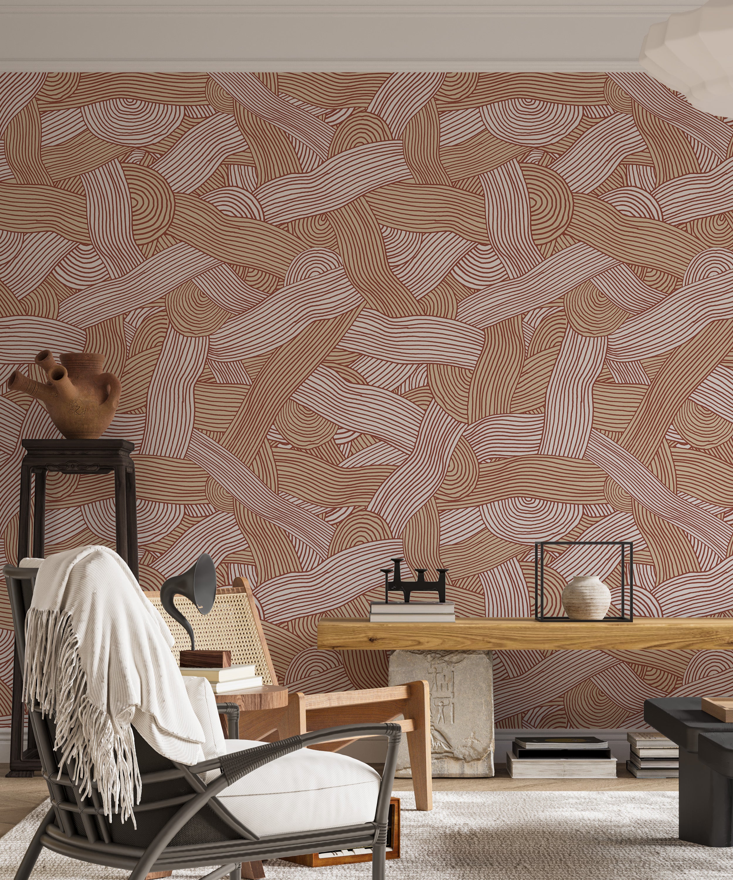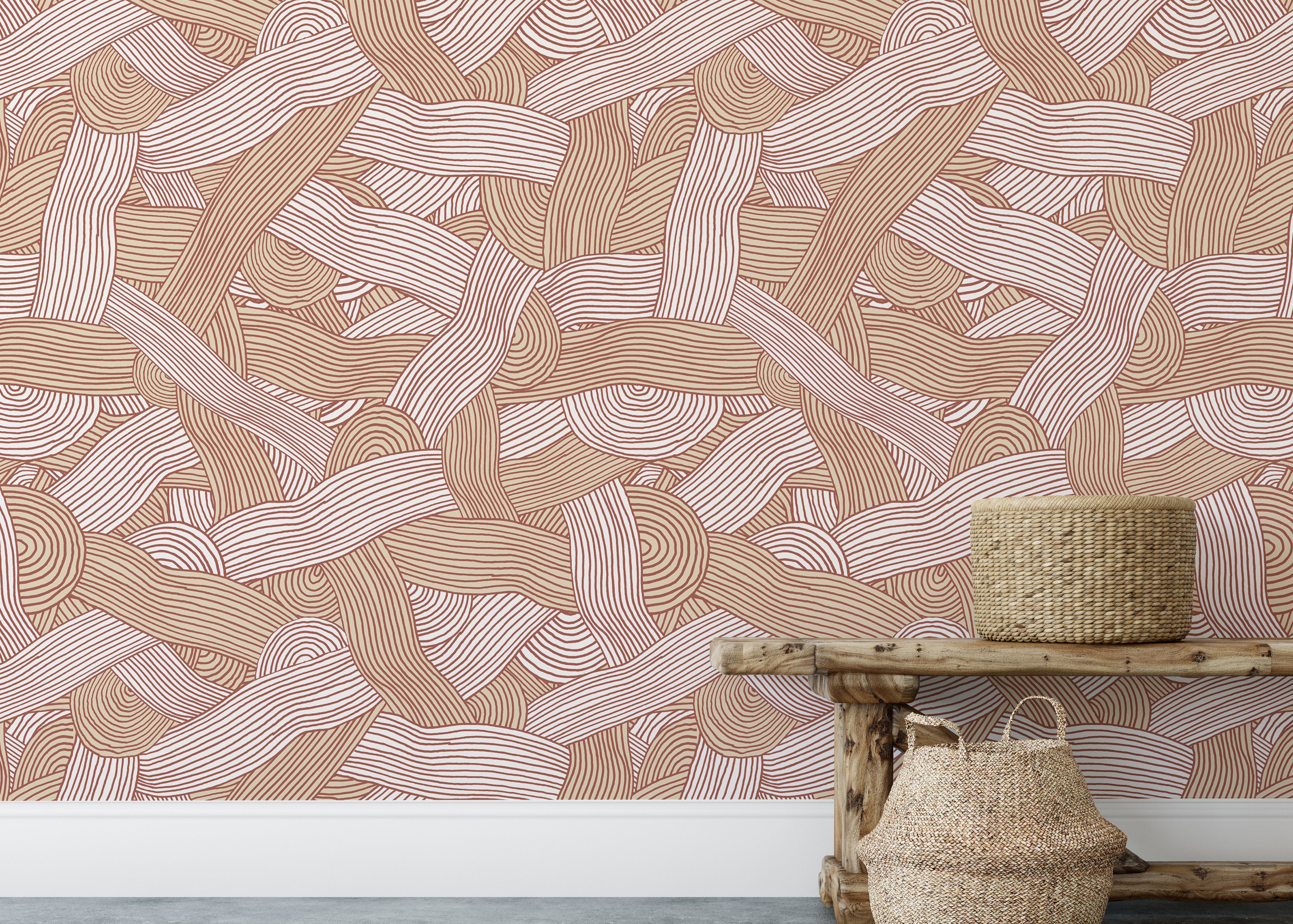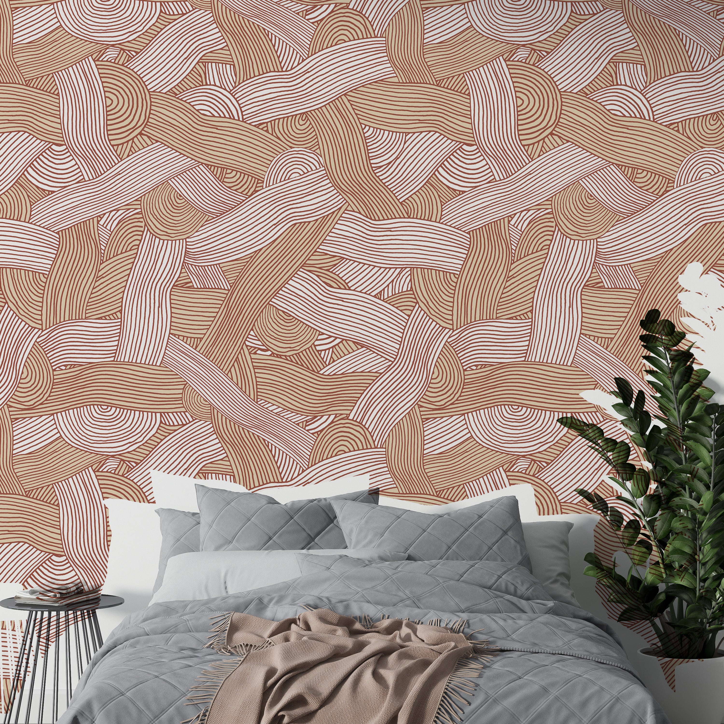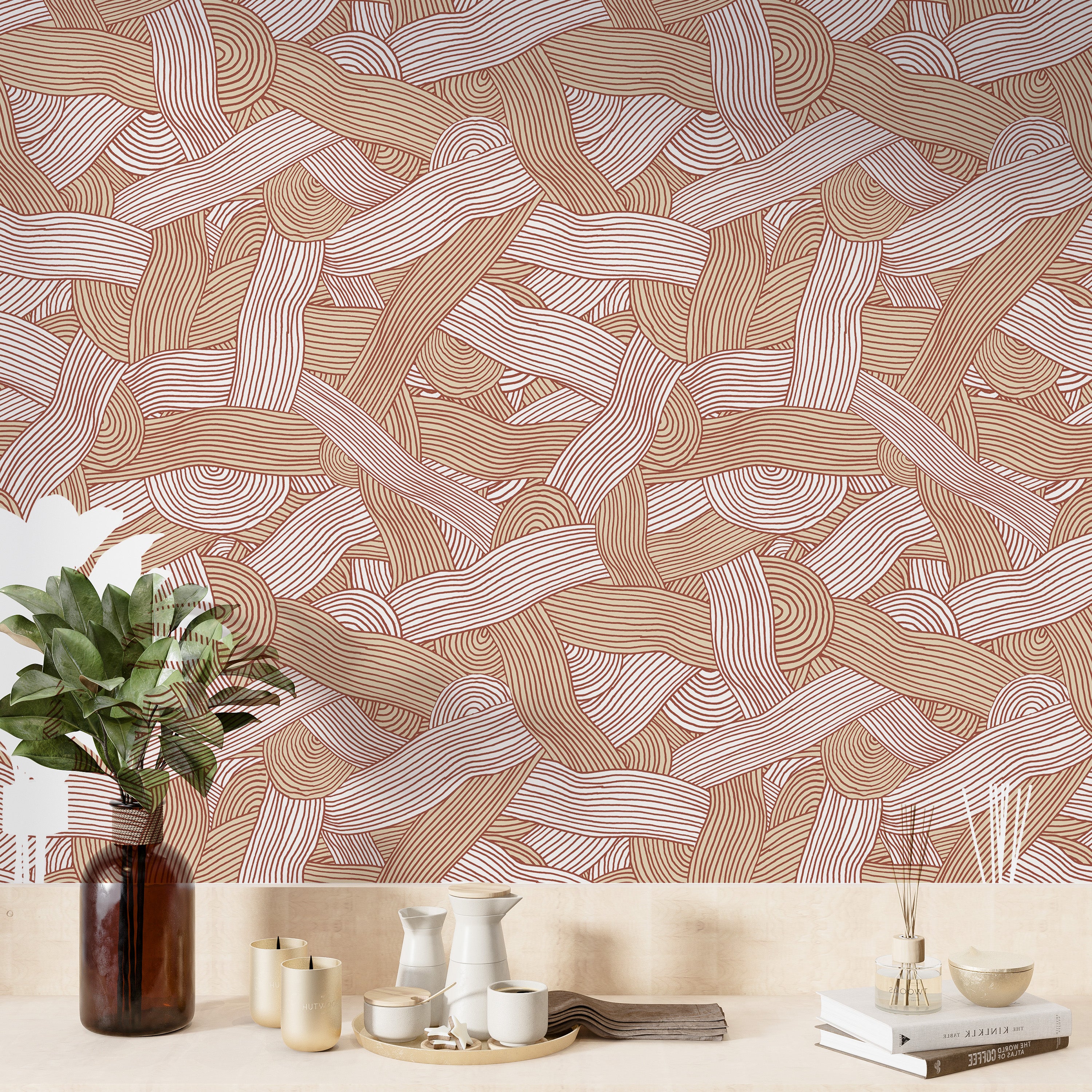 Woven Sands is a captivating wallpaper design featuring an intricate interplay of beige and terracotta lines, creating a mesmerizing textured effect. The seamless pattern evokes a sense of warmth and calm, reminiscent of sun-drenched dunes or flowing fabrics. Its organic, hand-drawn quality lends a touch of artistry and sophistication, making it perfect for adding a touch of understated elegance to any room. The neutral color palette allows it to blend seamlessly with various interior styles, from minimalist to bohemian. Let the rhythmic lines and earthy hues create a tranquil atmosphere in your space.