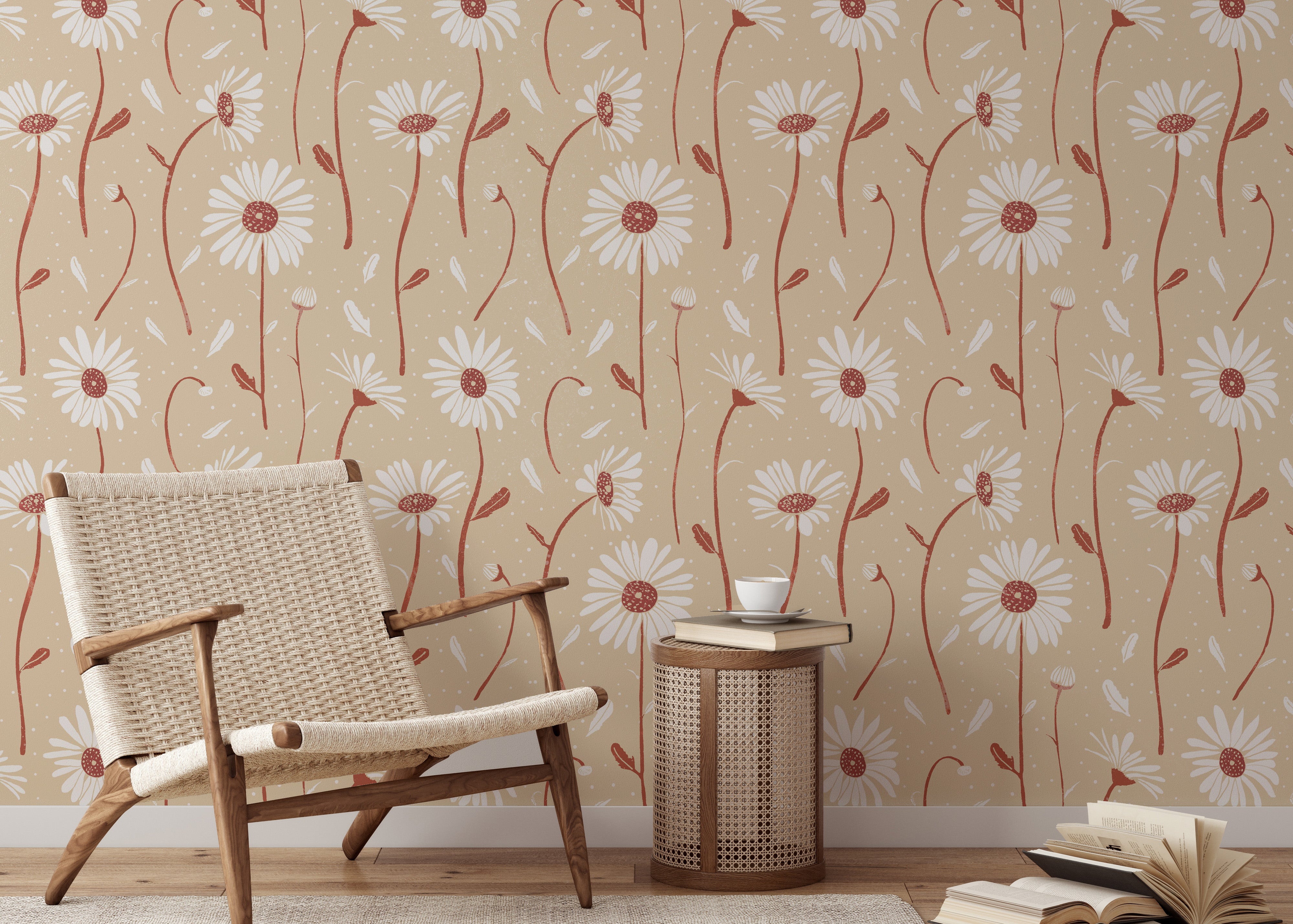 This wallpaper transports you to a rustic meadow bathed in soft sunlight. The design features a charming repeat pattern of simplified daisies with terracotta stems and white petals, rendered in a textured, slightly imperfect style. Small white dots and leaves add depth and movement, creating a subtle, airy feel. The earthy color palette of beige and terracotta is both calming and inviting, perfect for adding a touch of nature-inspired charm to any room. Ideal for those seeking a peaceful, organic aesthetic.