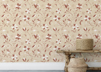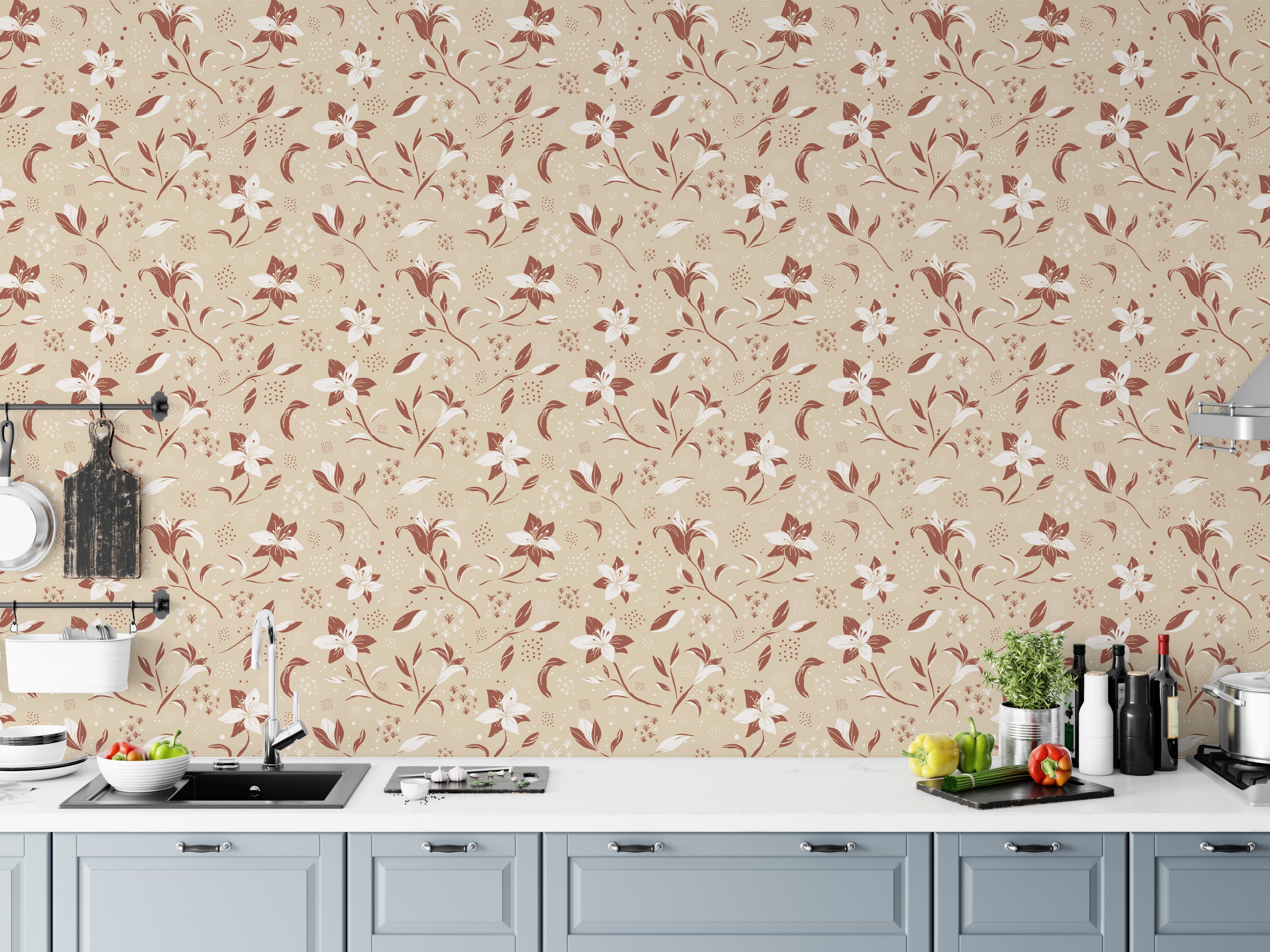 Embrace the beauty of rustic charm with this wallpaper. Its design features a captivating interplay of stylized lilies, rendered in warm terracotta and creamy off-white shades against a beige backdrop. The organic forms of the flowers are enhanced by the inclusion of abstract elements like dots and dashes, adding a touch of modern design sensibility. The overall effect is one of relaxed sophistication, perfect for spaces that crave a blend of natural elegance and artistic expression. This wallpaper effortlessly enhances any room, adding a feeling of calmness and understated luxury.