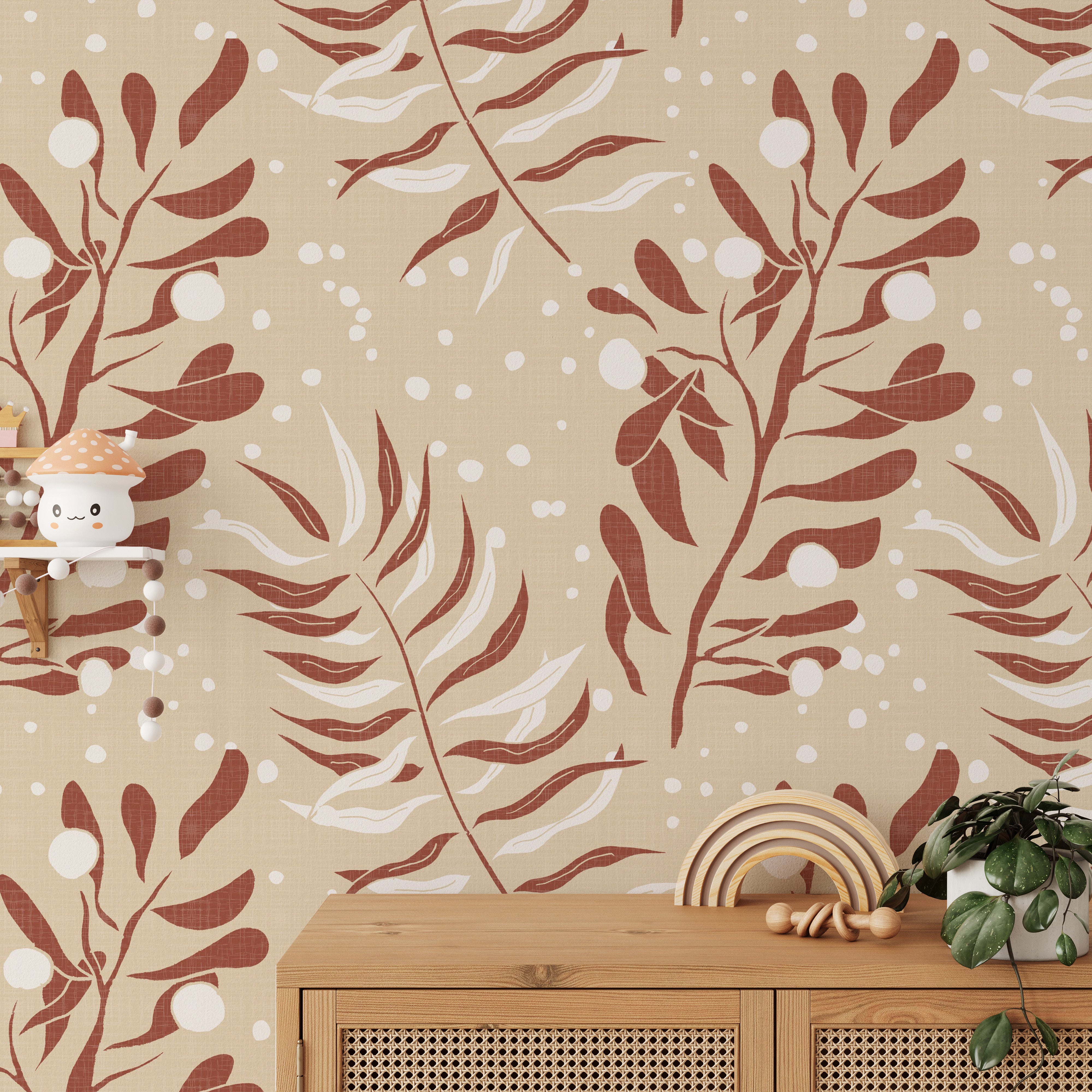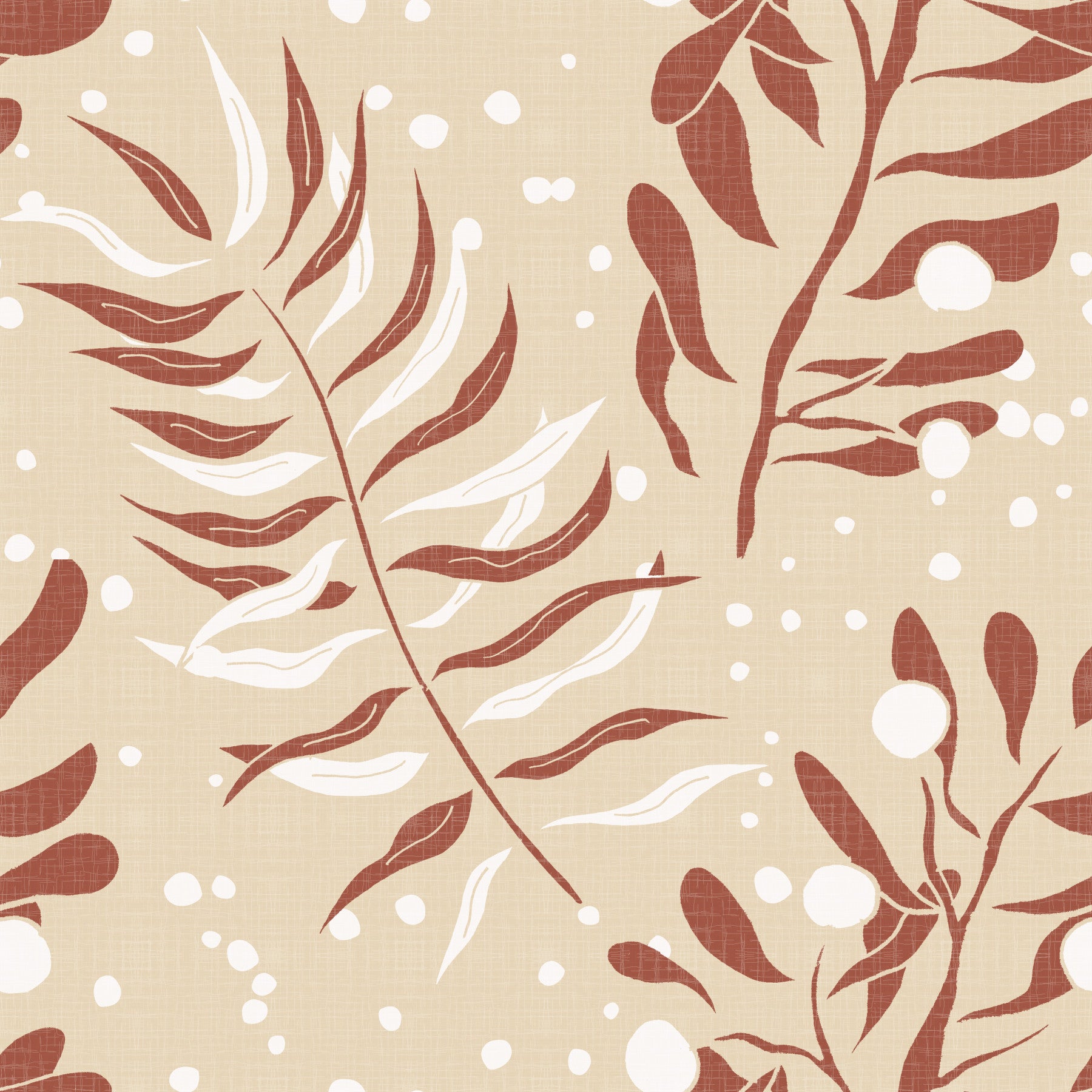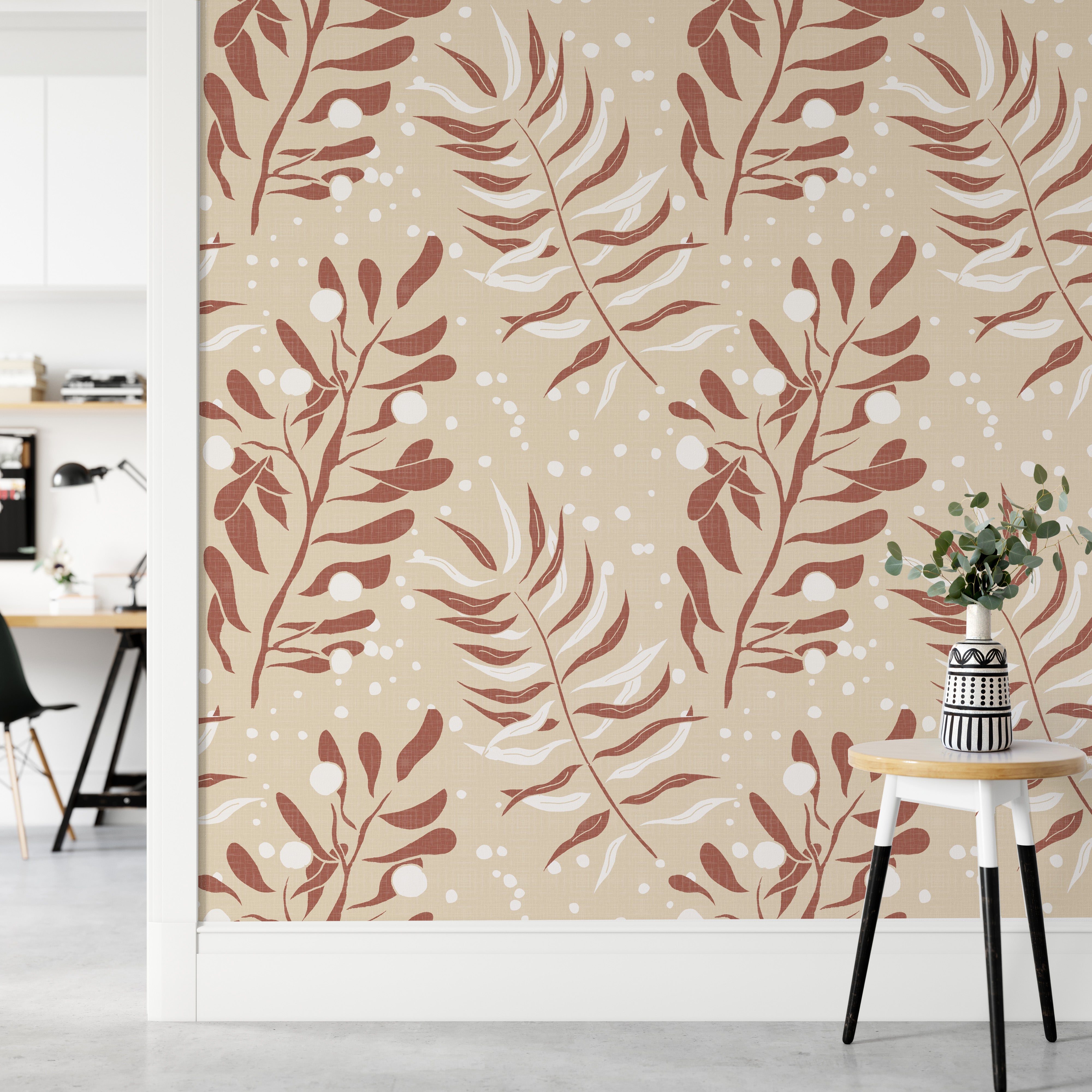 This abstract wallpaper features a repeating pattern of stylized leaves in soft terracotta and cream hues on a beige linen-textured background. The design is simple yet elegant, offering a versatile option for various room settings. Its calming and neutral tones create a serene atmosphere, making it ideal for bedrooms, living rooms, or even offices. The subtle texture adds visual depth, enhancing its sophisticated aesthetic appeal. This sophisticated pattern lends itself perfectly to modern and minimalist decor schemes.