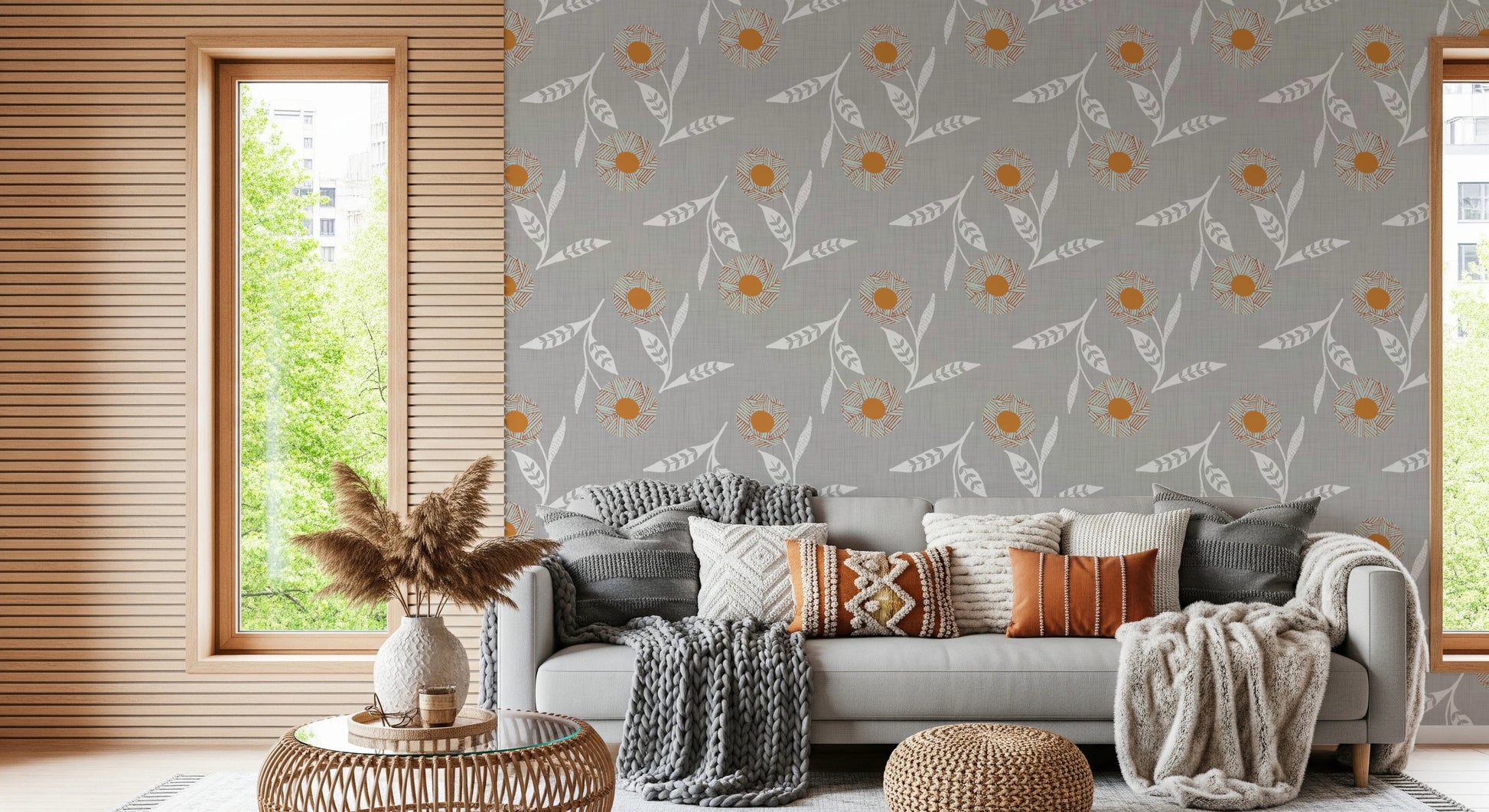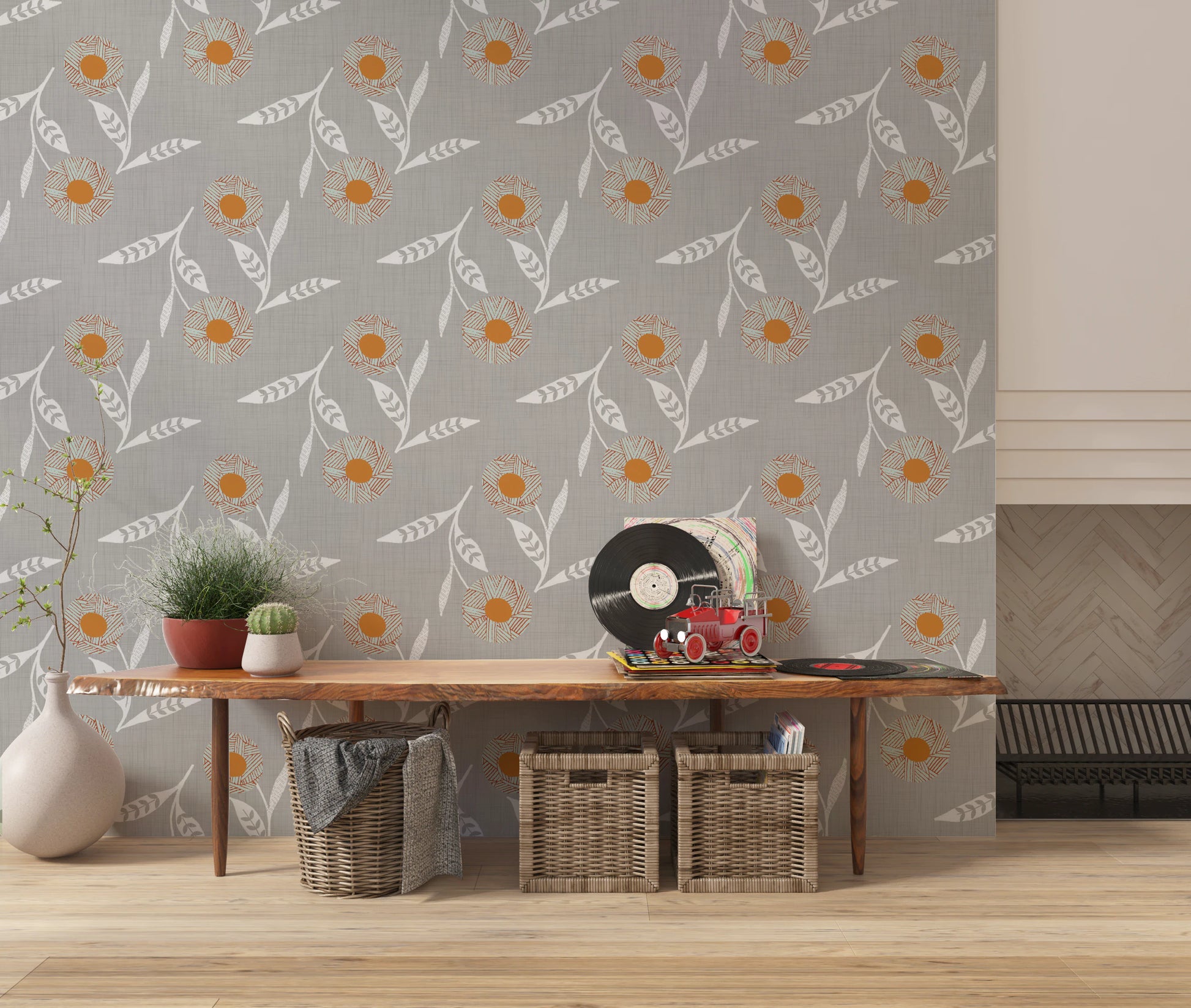 Embrace the serene charm of Scandinavian design with our 'Cozy Scandi Flower Warm Linen' wall covering. This craft botanical pattern presents stylized floral motifs, marrying rustic warmth with minimalist elegance. Delicate, white floral stems dance across a subtly textured, linen-look background, creating a soothing visual experience. The stylized flowers, featuring a warm orange centre and unique linear detailing in muted hues, bring a touch of artistic craftsmanship to any room. This understated yet captivating design evokes a sense of calm and natural beauty, perfectly complementing a modern, cosy, or nature-inspired interior. Infuse your space with the tranquil simplicity of Scandi style and the gentle allure of botanical art.