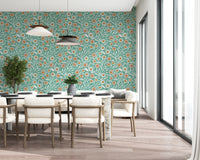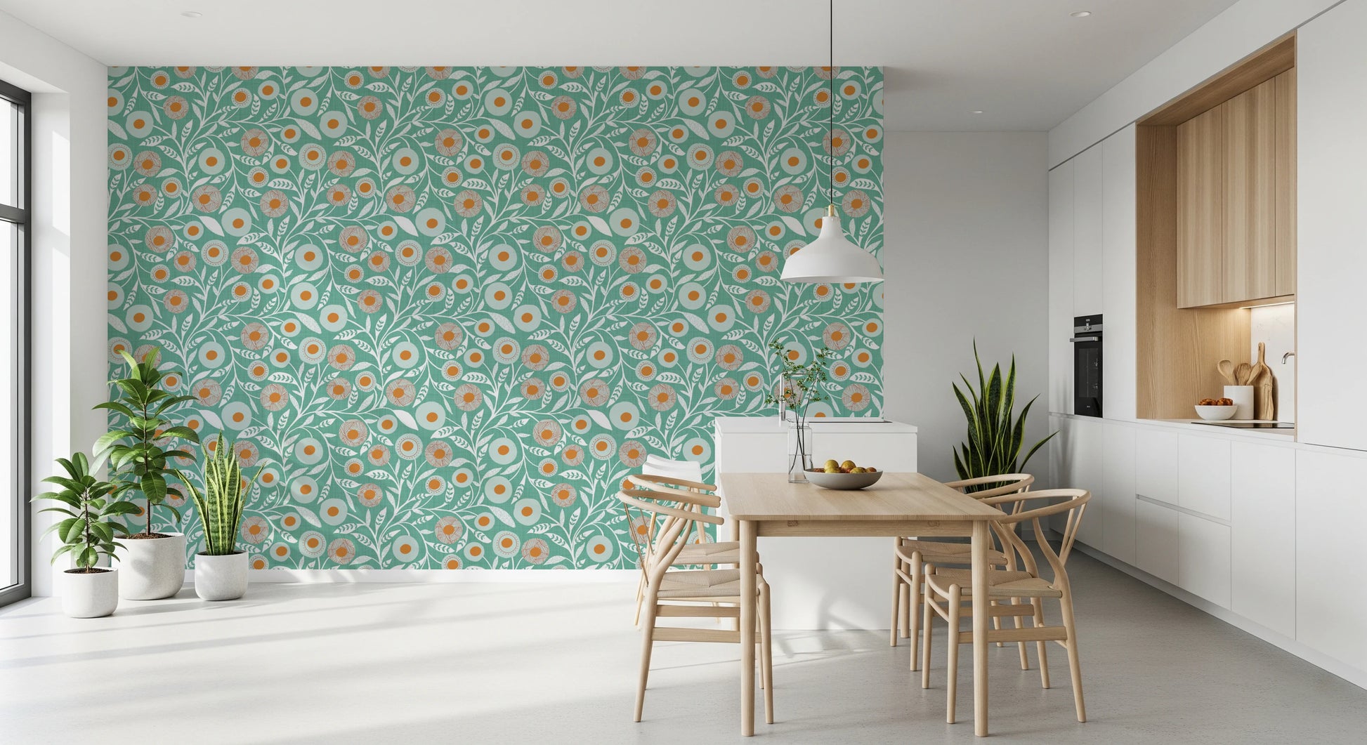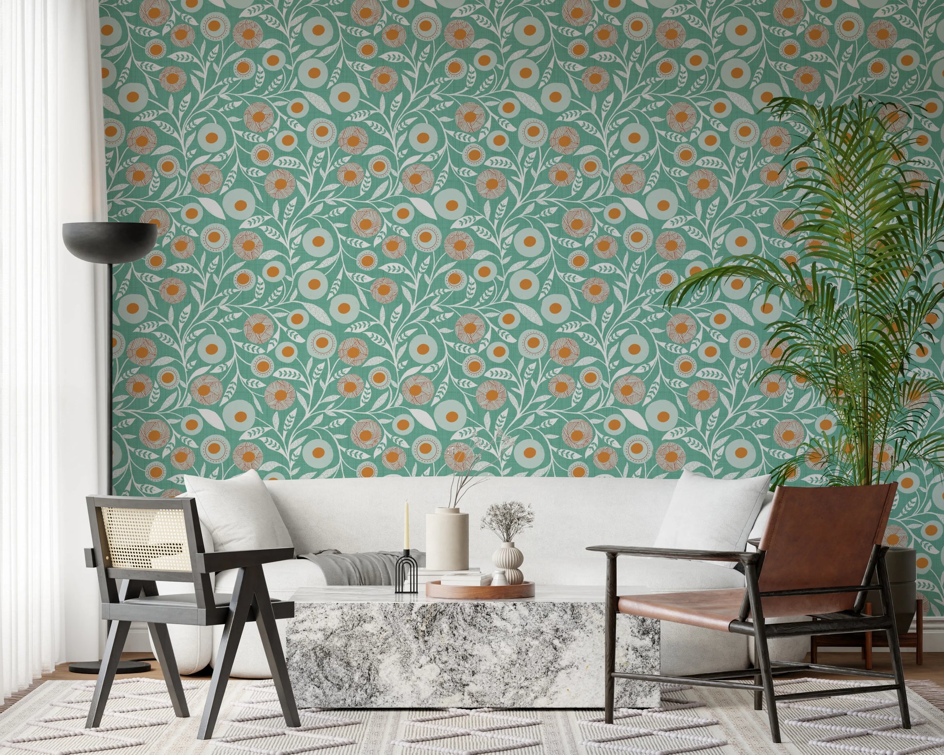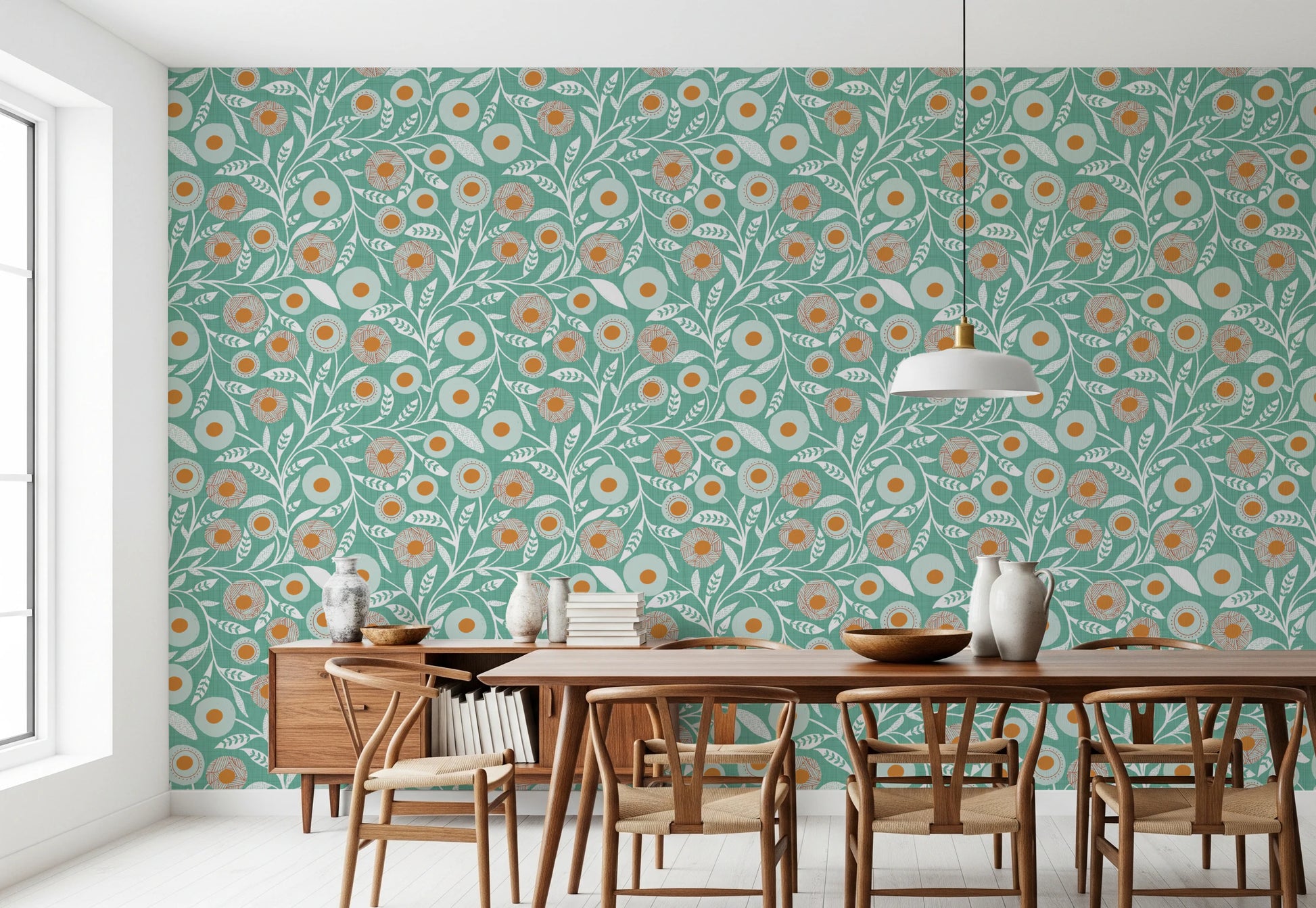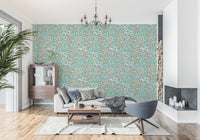Embrace the inviting warmth of Scandinavian design with this folk-inspired floral wall covering. A serene sage mint backdrop sets the stage for a captivating dance of botanical motifs. Charming blooms in muted blues and meticulously crafted patterns add a touch of handcrafted artistry to any space. Delicate white foliage weaves its way through the design, creating a sense of movement and natural elegance. Infuse your interiors with the calming and cheerful spirit of the Nordic countryside, bringing a sense of hygge to your home. This unique wall décor will transform your walls into a cozy, inviting canvas.