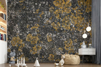Introduce organic style to your walls. A sophisticated palette of grey and gold blend in this rough stone aesthetic. This design mimics weathered rock surfaces with lichen accents. Perfect as wallpaper for walls to complement diverse environments. This versatile wallpaper works well in dining rooms, home libraries, and modern bedrooms. Add visual depth and earthy undertones to any room.
