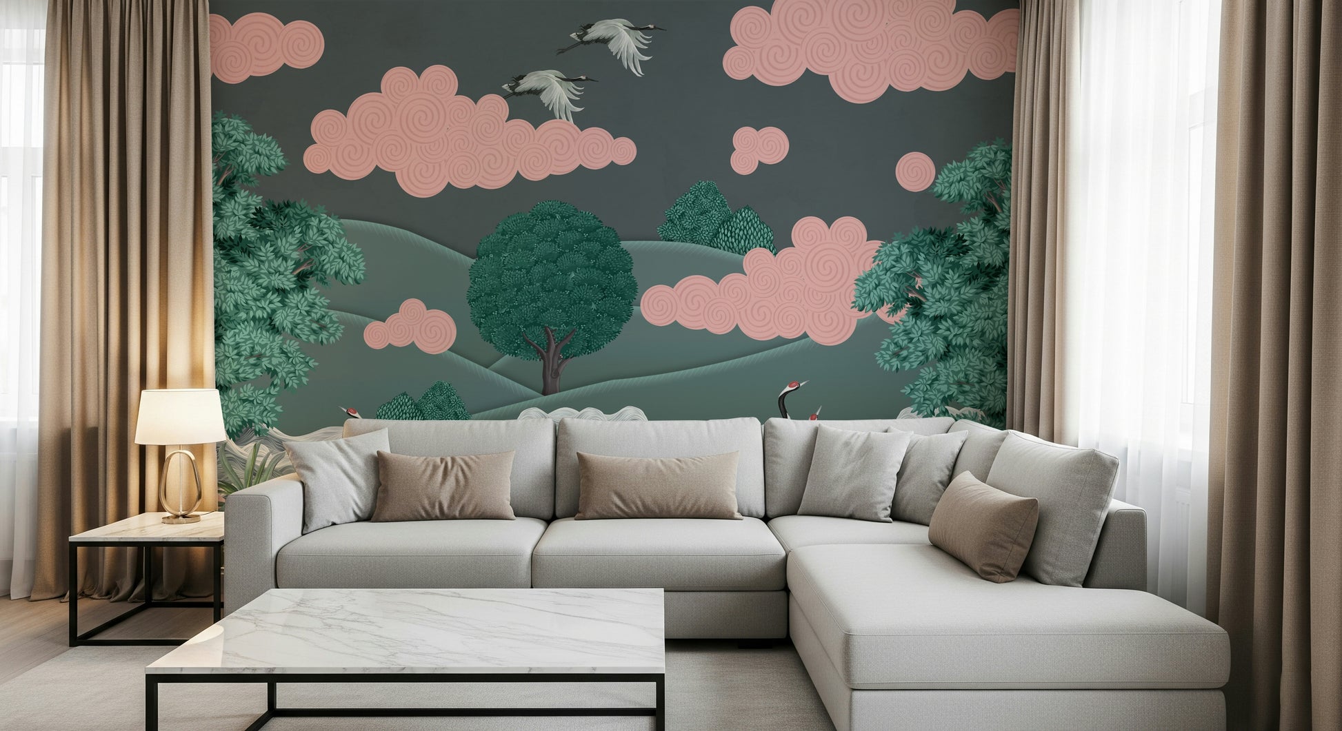 Invite a sense of calm into your home with this serene landscape design. A muted palette of teal, grey, and blush pinks creates a dreamy scene with swirling cloud formations. Delicate cranes add a touch of elegance, making this wallpaper for walls a perfect choice for bedrooms, living rooms, or even a tranquil office space. The artistic style and balanced composition will effortlessly complement minimalist or modern interiors.