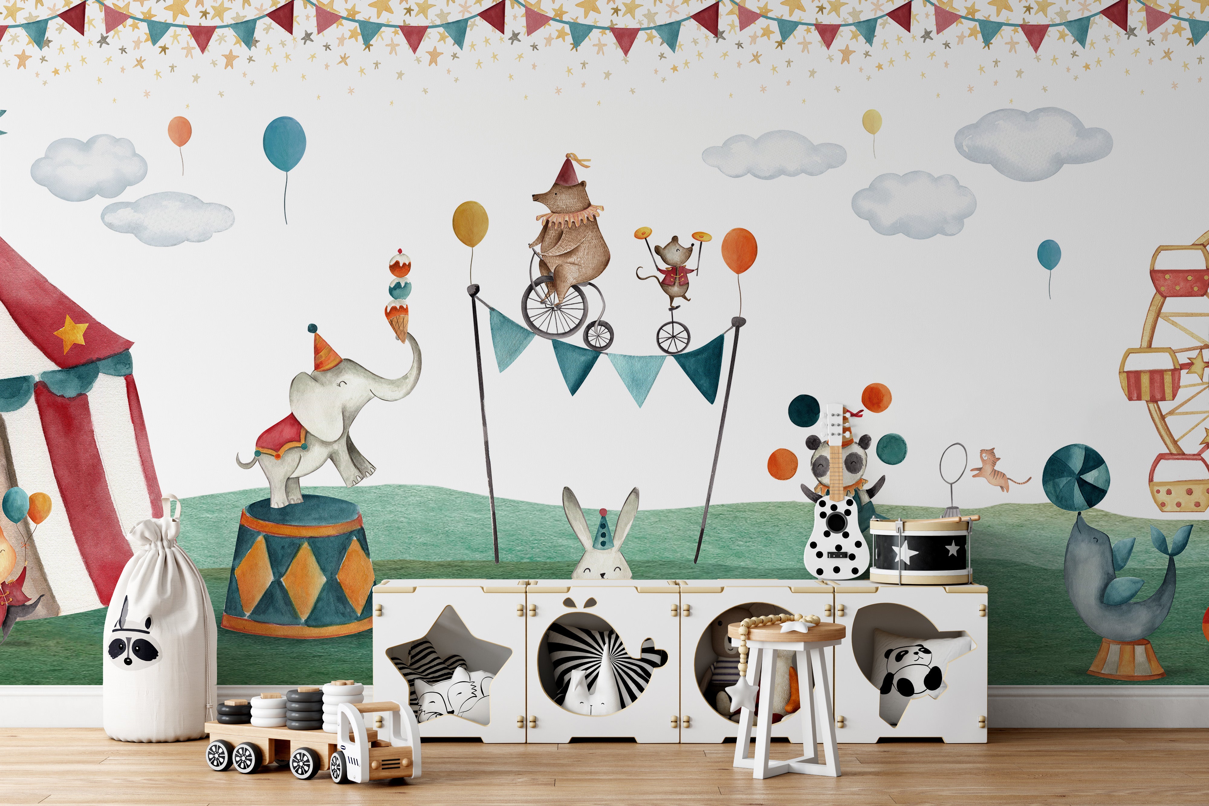 Circus-themed wallpaper mural with bear and Ferris wheel