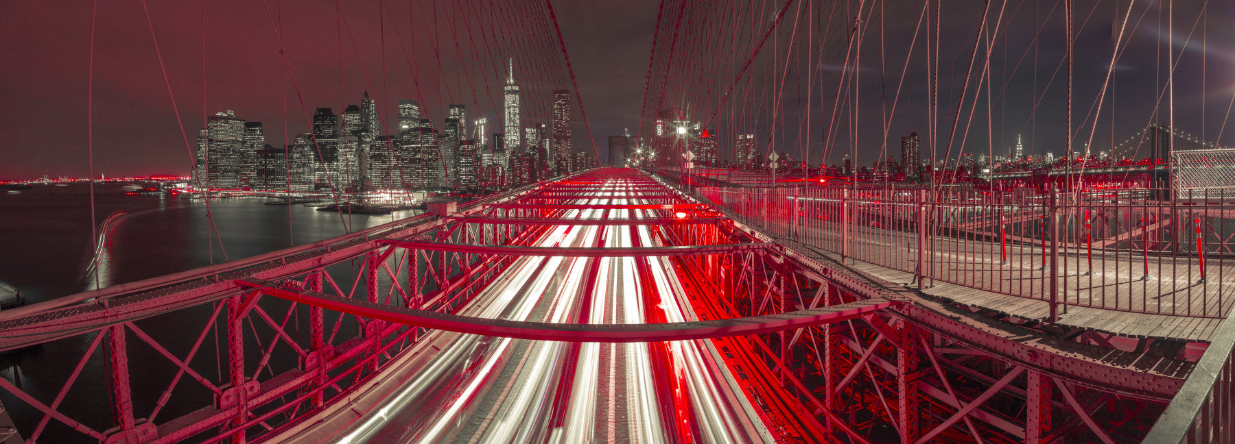 Night view of Brooklyn bridge with strip lights, New York. Gaze across the skyline with this dramatic city vista. Light streaks illuminate the bridge, drawing your eye toward the towering metropolis. Red hues create a bold statement. This design injects energy into any room. Use this wallpaper for walls to craft a unique and modern space. It makes a great addition to urban apartments, offices, or studios. It brings a powerful touch of modern life. Watch it transform interiors, offering a dynamic backdrop to contemporary furnishings.