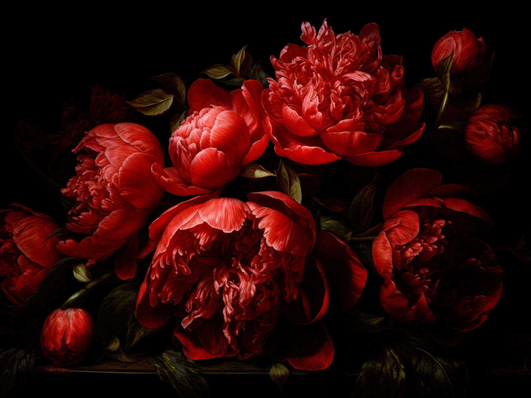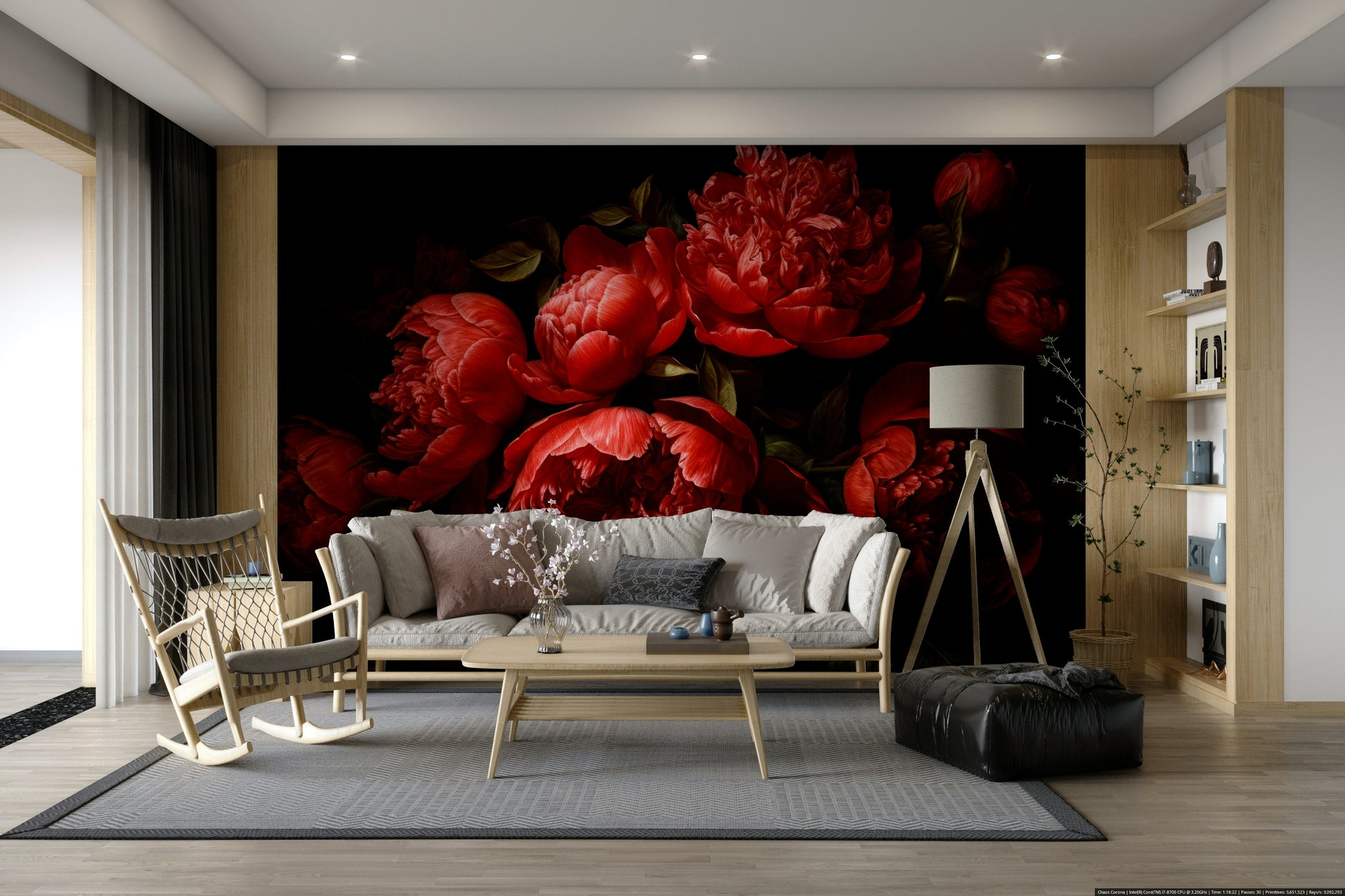 Experience a moody romance with Crimson Night Blooms. Deep reds create a stunning contrast against a black background, enhancing its dramatic, enchanting vibe. The luxurious floral style adds sophistication to any space. Enliven your bedroom or dining room with this stunning wallpaper for walls that brings dark, alluring botanical charm. Complement dark woods or jewel tones, creating a captivating atmosphere. This selection adds an edge to contemporary interiors.