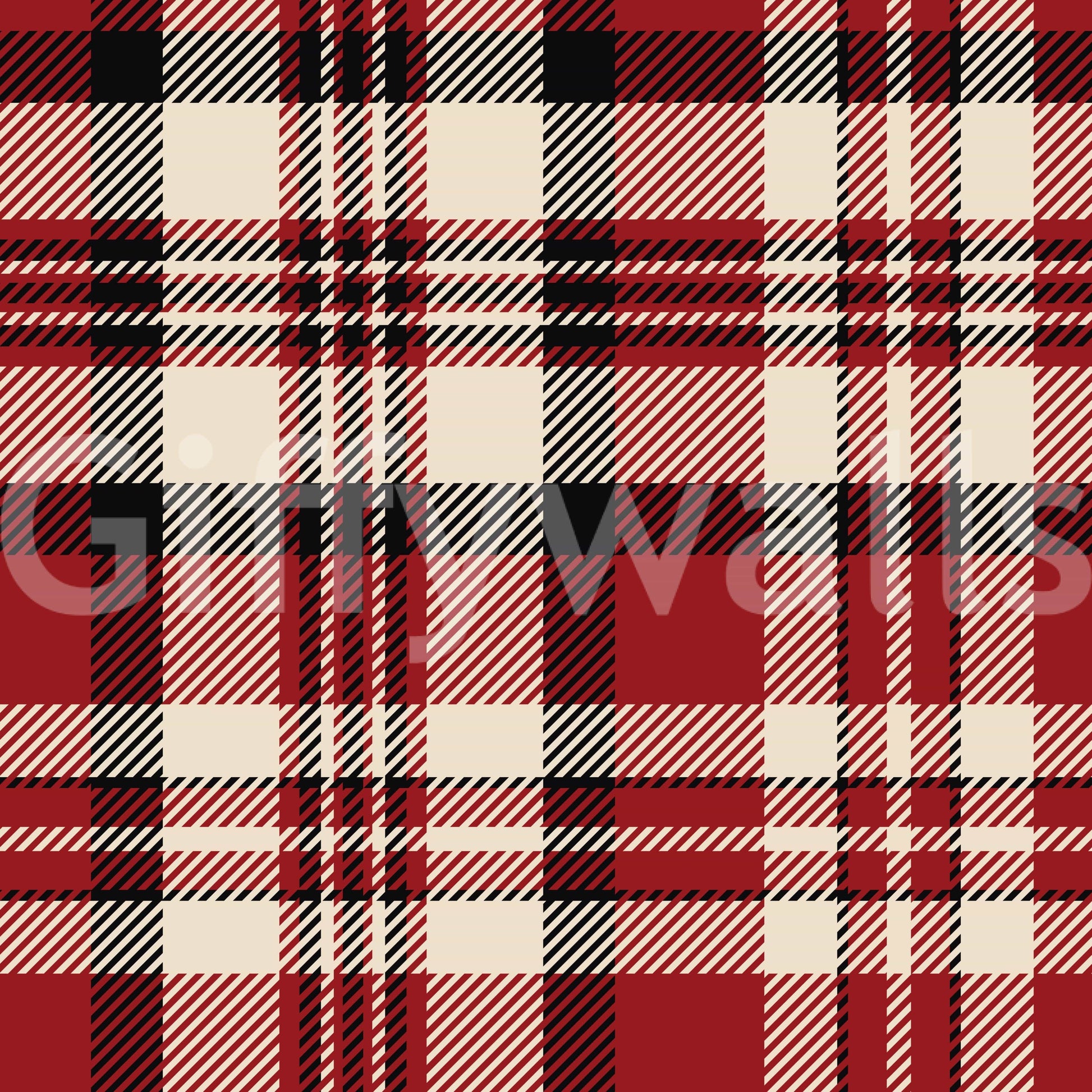 Bring a sense of cosy charm to your space with this traditional plaid design. Bold crimson stripes intersect with cream and black lines, creating a balanced pattern. The wallpaper for walls offers a timeless aesthetic. It suits a living room, study, or bedroom, adding warmth and a touch of classic style. Let this geometric motif enrich interiors with its comforting pattern.