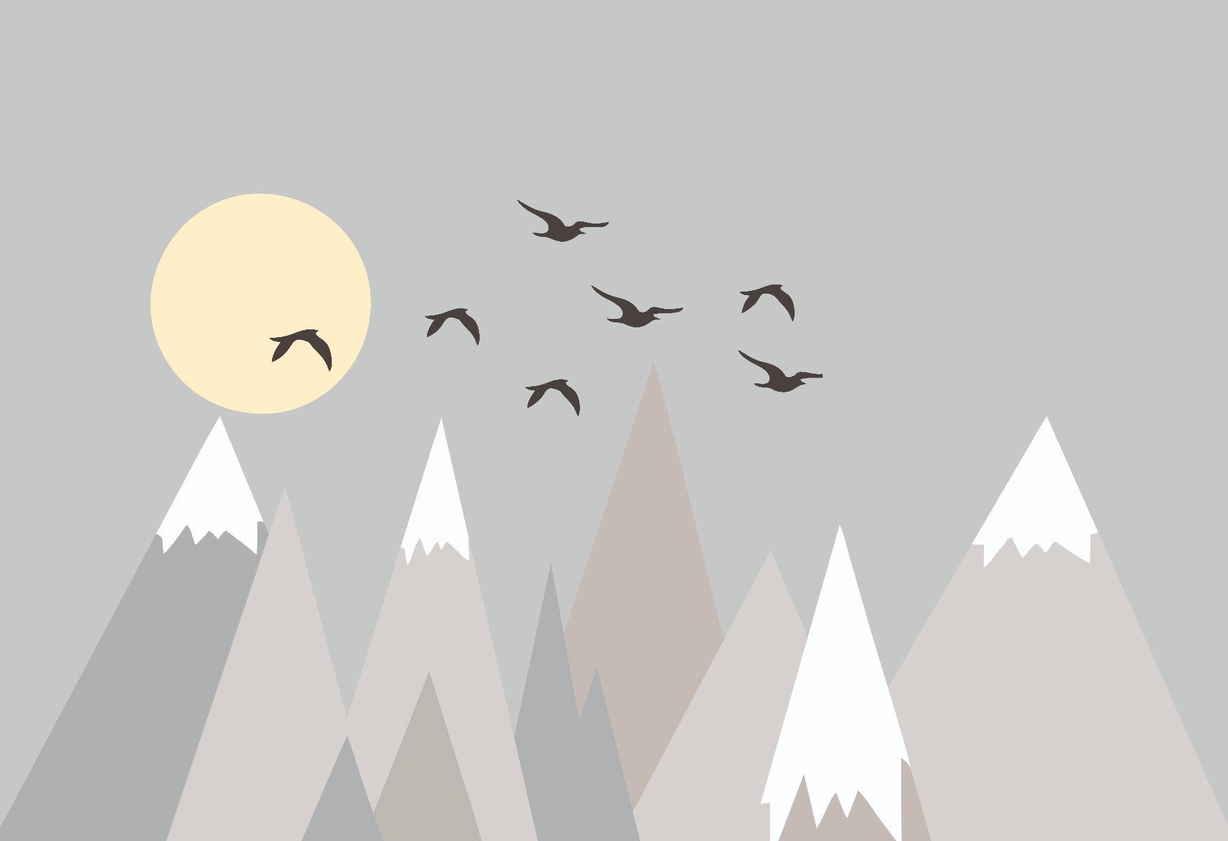 Create a magical atmosphere in your kids' room with the glorious grey mountains wallpaper mural. Featuring pastel mountains and silhouettes of flying birds, this photo mural brings nature's serenity right into your home. The grey color scheme harmonizes with any decor, making it a versatile choice for a sophisticated update.