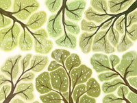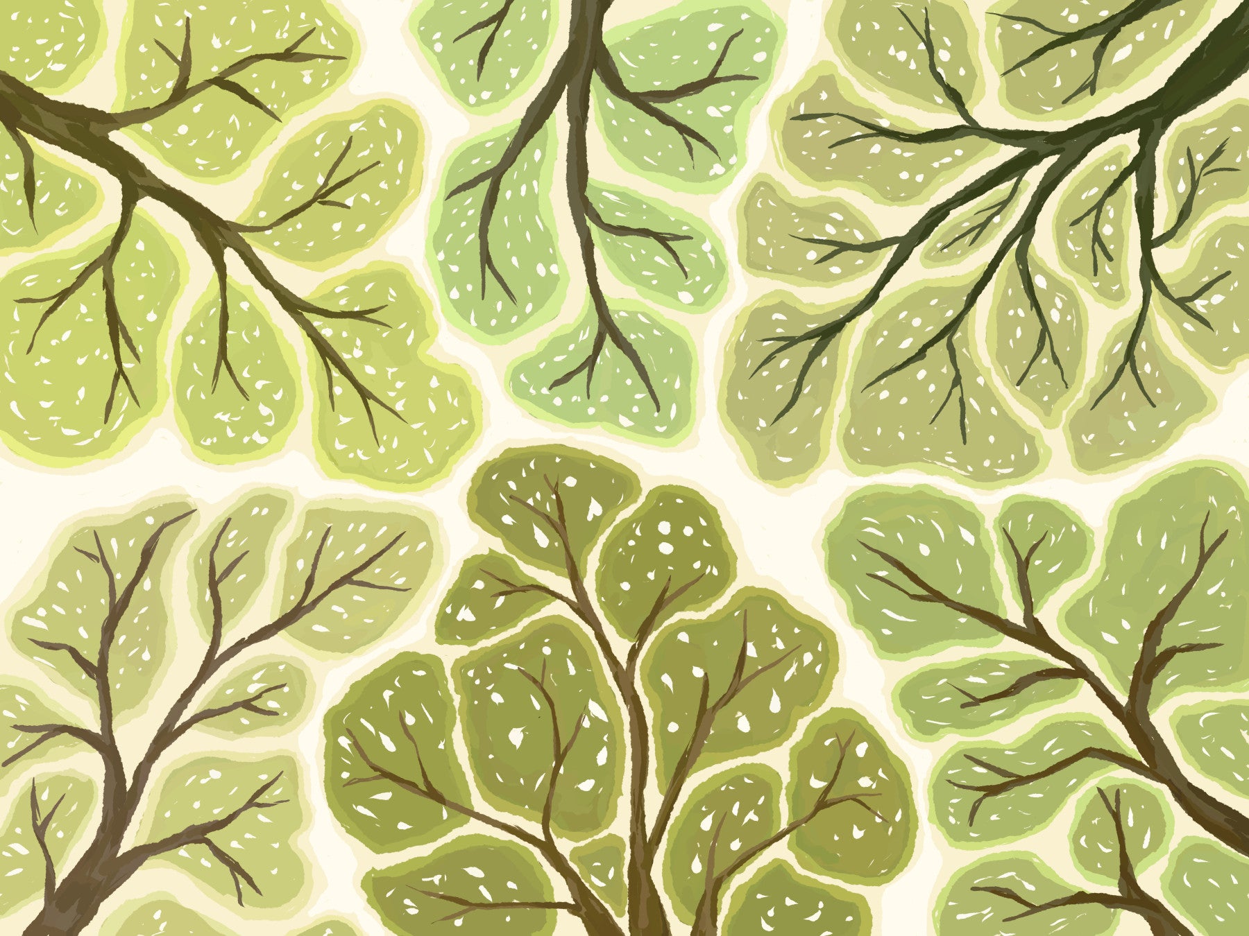 Experience the serene beauty of 'Crown Shyness' with this captivating wallpaper. From a bird's-eye view, the stylized forest canopy reveals a mesmerizing pattern of individual tree crowns that delicately avoid touching each other, creating a breathtaking mosaic of green and cream hues. The artistic rendering evokes a sense of peaceful harmony and the intriguing natural phenomenon of crown shyness in a lush, tranquil forest. This wallpaper brings a touch of nature's mystery and wonder to your screen, perfect for those seeking a calming yet visually stunning digital backdrop. The soft color palette and unique artistic style offers a refreshing visual escape.
