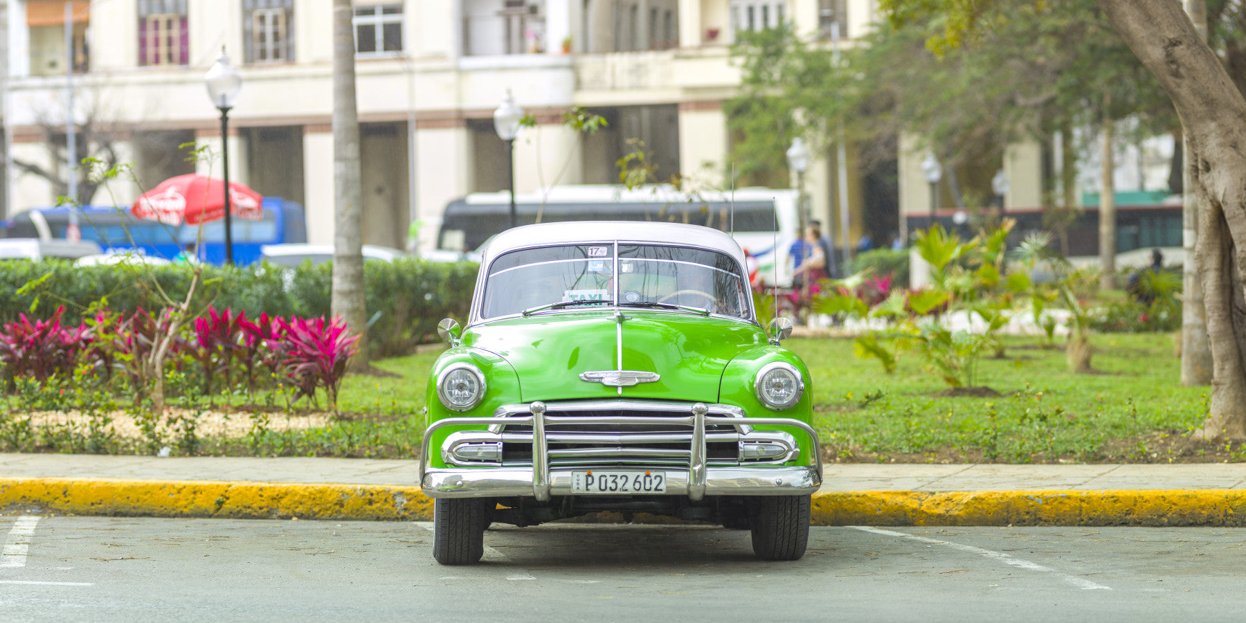 Vintage car on street of Havana, Cuba. Capture the charm of Havana with this vivid green vintage car wallpaper. The iconic taxi design adds a touch of nostalgia and vibrant colour to any room. The bright green contrasts against the muted city backdrop, creating a striking visual. Transform your living room, office, or bedroom with this unique wallpaper for walls, and bring a piece of Cuban culture into your home. It complements interiors with a classic, retro vibe.