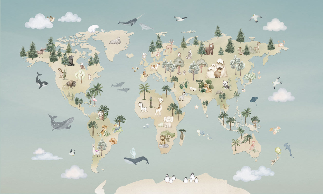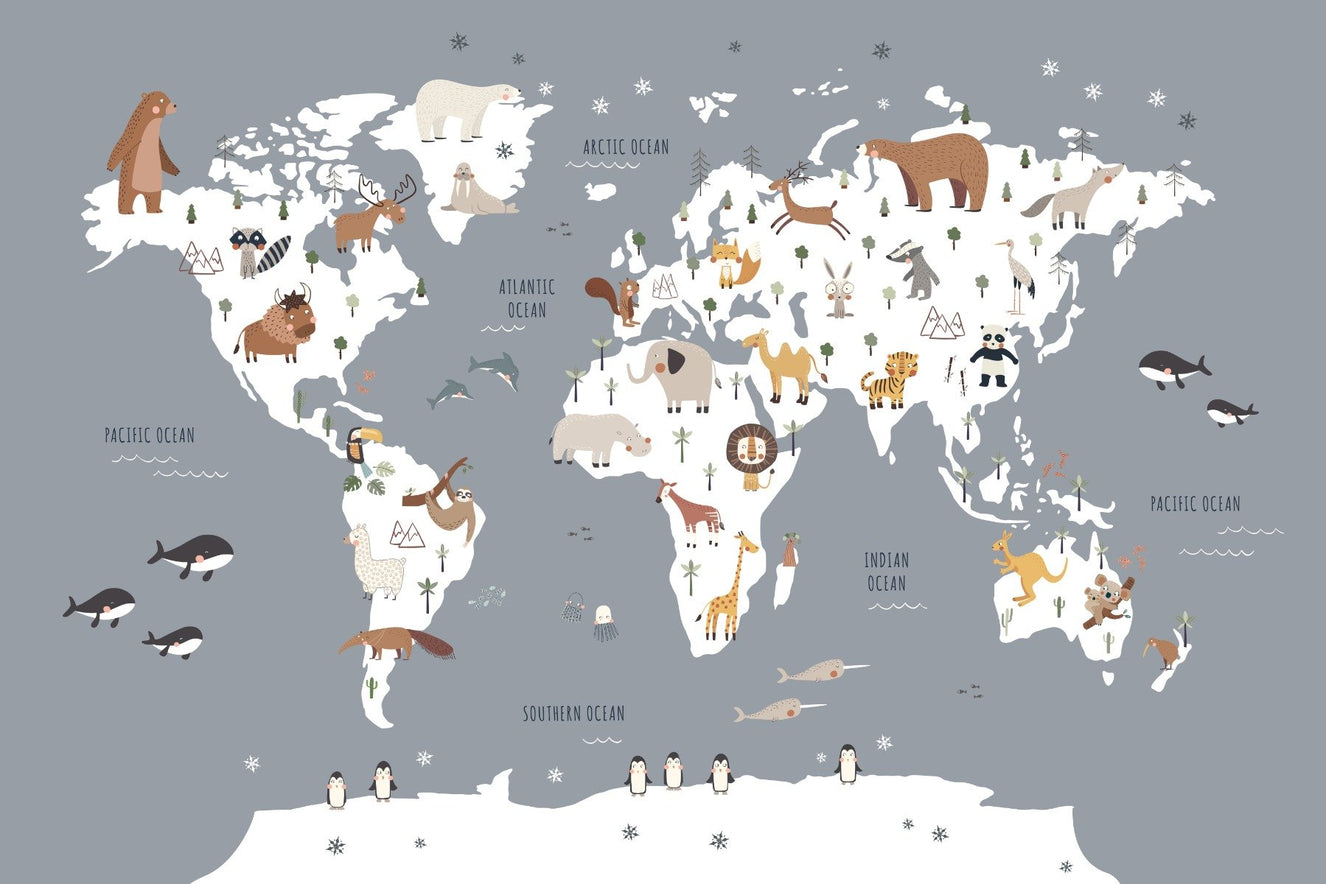 Embark on a delightful journey with the cuddly creatures atlas mural, a charming kids world map wallpaper that invites young explorers to discover the globe's wonders. Each continent brims with friendly animals, showcasing the natural beauty that thrives from Africa's savannahs to the icy realms of Antarctica. Perfect for nurturing curiosity and learning, this magical piece creates a playful and educational focal point in a child's room. Watch as little ones trace the pathways of dolphins and follow the flight of birds, igniting their imaginations and fostering a love for our diverse planet. This kids world map wallpaper is more than just a decoration; it's a gateway to adventure for every young adventurer.