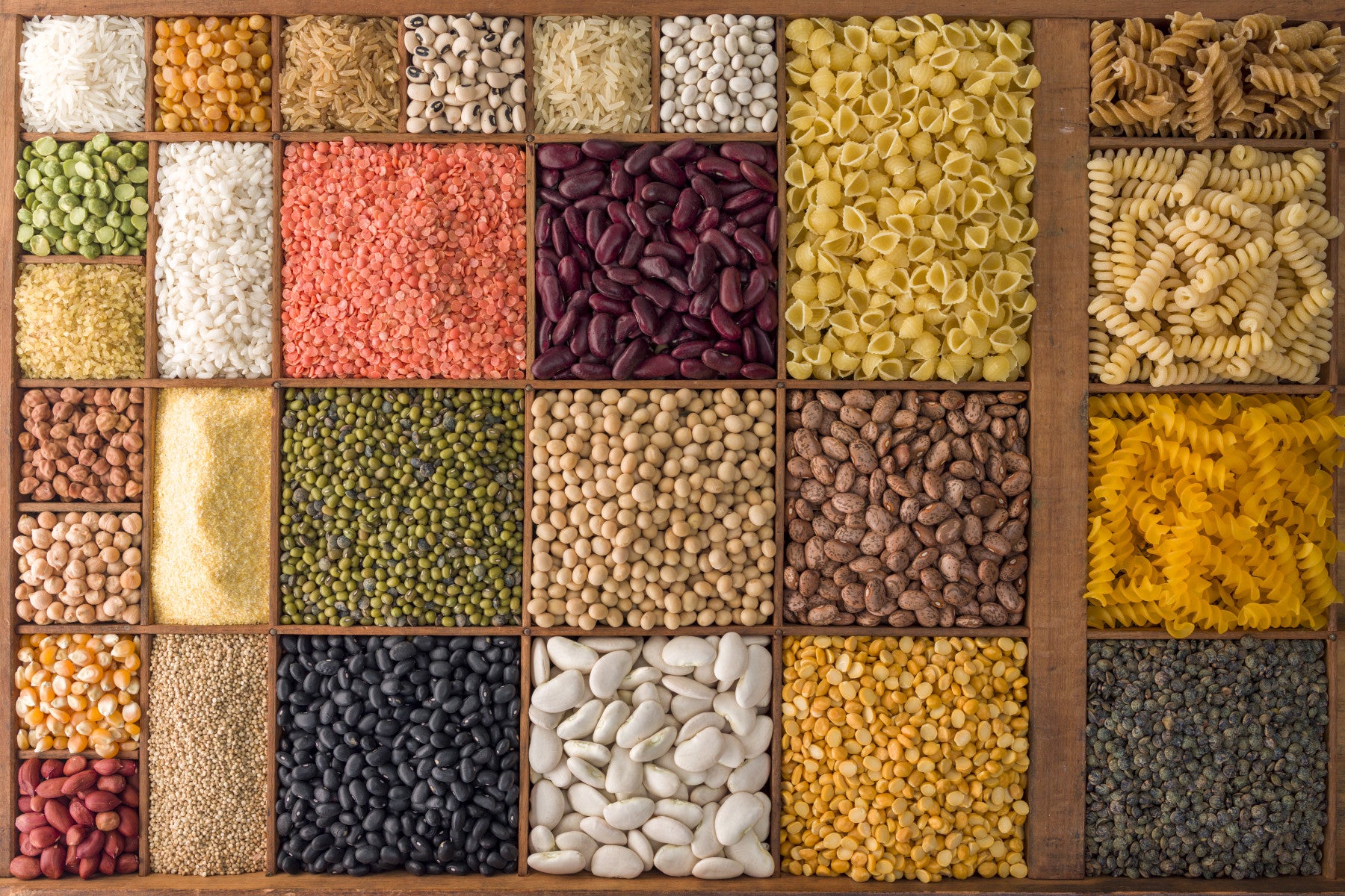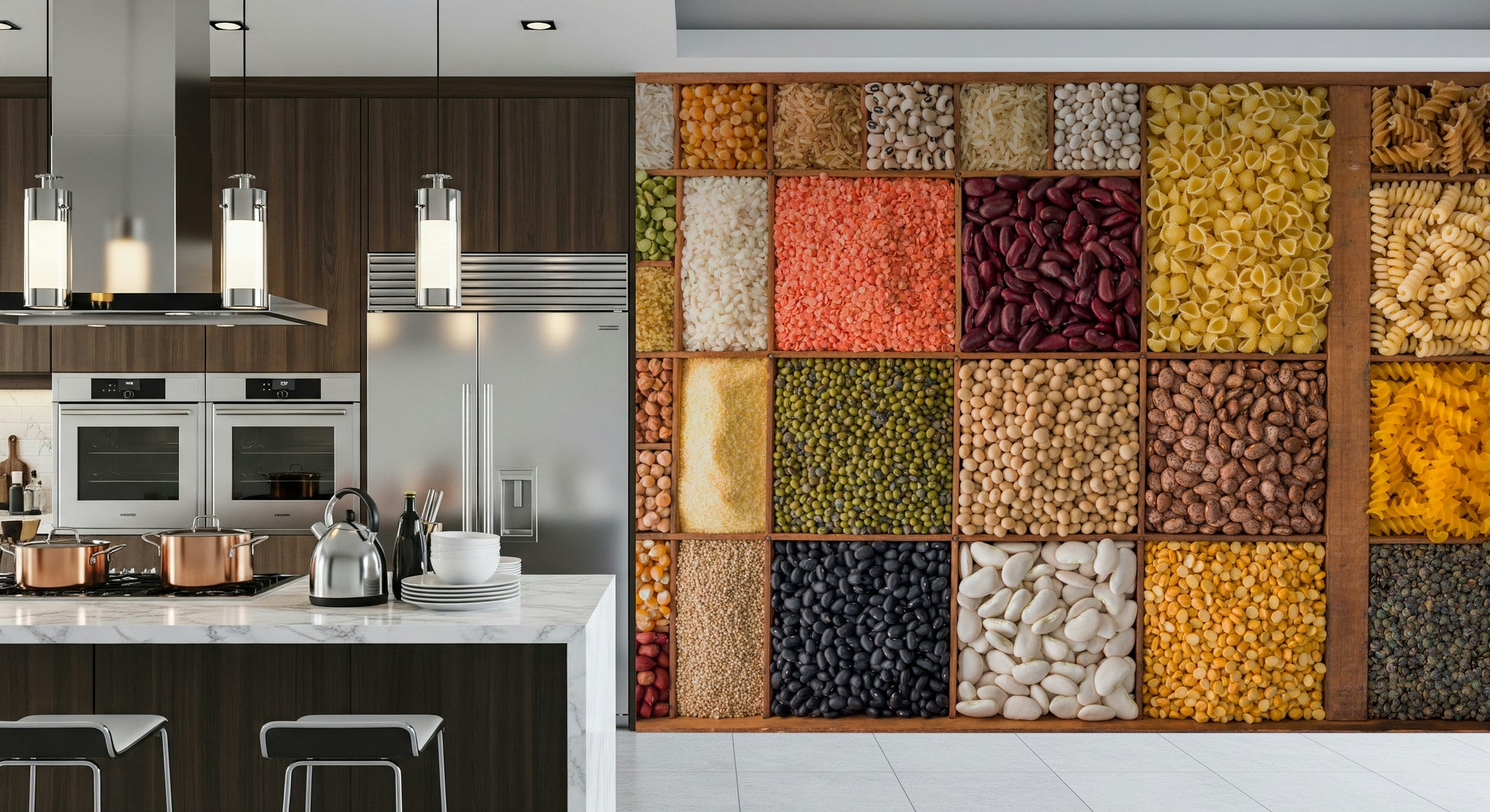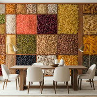 Showcase your culinary passion with this unique wallpaper for walls. This design features a variety of dried goods, grains, and pasta neatly arranged in a wooden box. The warm tones of brown, beige, and yellow create a cosy and inviting atmosphere. Place it in your kitchen or dining room to add character and a touch of rustic charm. It works well with farmhouse, cottagecore, and minimalist interiors. The organised display presents a comforting and stylish visual, perfect for those who love food and cooking.