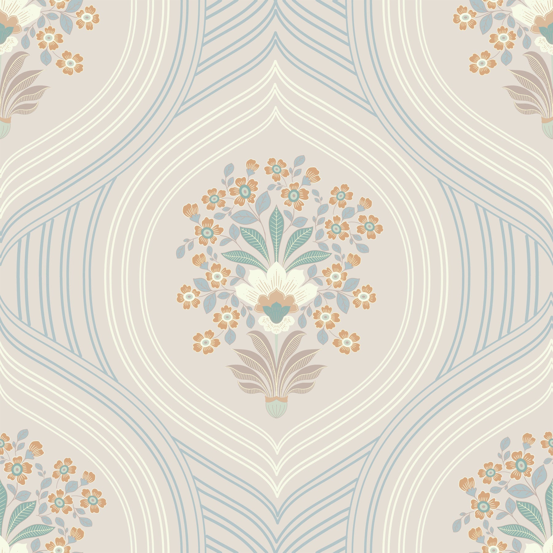 This wallpaper design features a captivating interplay of curved lines and delicate floral motifs. The flowing lines create a sense of movement and rhythm, while the soft-hued flowers add a touch of organic charm. The neutral color palette, primarily consisting of beige, soft blue-gray, and muted orange, exudes a tranquil and calming ambiance. This design is incredibly versatile, making it a perfect choice for various spaces such as bedrooms, living rooms, or hallways. The subtle yet intricate patterns add a touch of understated elegance, creating a soothing and sophisticated environment that promotes relaxation and peace. Its versatility allows for seamless integration into modern or traditional interior design schemes.