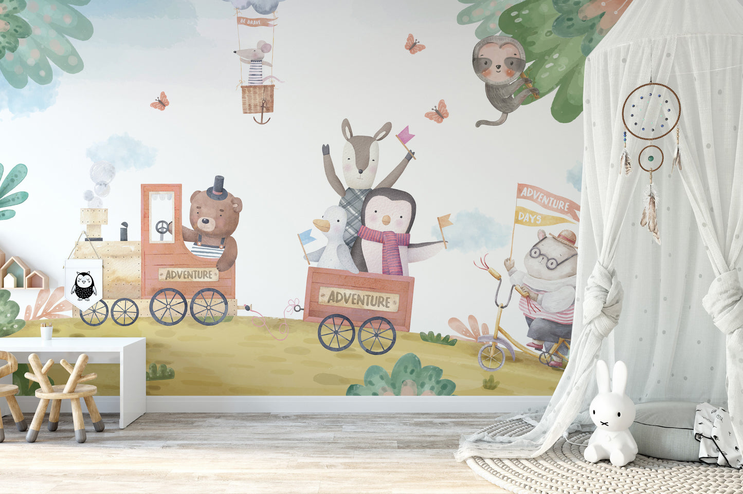 All aboard the adventure express! Cute Animal Train Wallpaper is a cute decoration for a baby's nursery that can spark a baby's imagination. In this nursery wall paper, the whimsical journey of a host of lovable animal friends traveling on a delightful train, conveys playful fun to the walls. Soft pastels and bright illustrations produce a soothing, but playful, ambience, which is ideal for napping or playing. See what your child's imagination goes for in happy dreams of exciting adventures with their new dog and birds. Simple to put up and wear off i.e, this wall covering does not merely decorate but tells of an event. Let the journey to a magical nursery begin!
