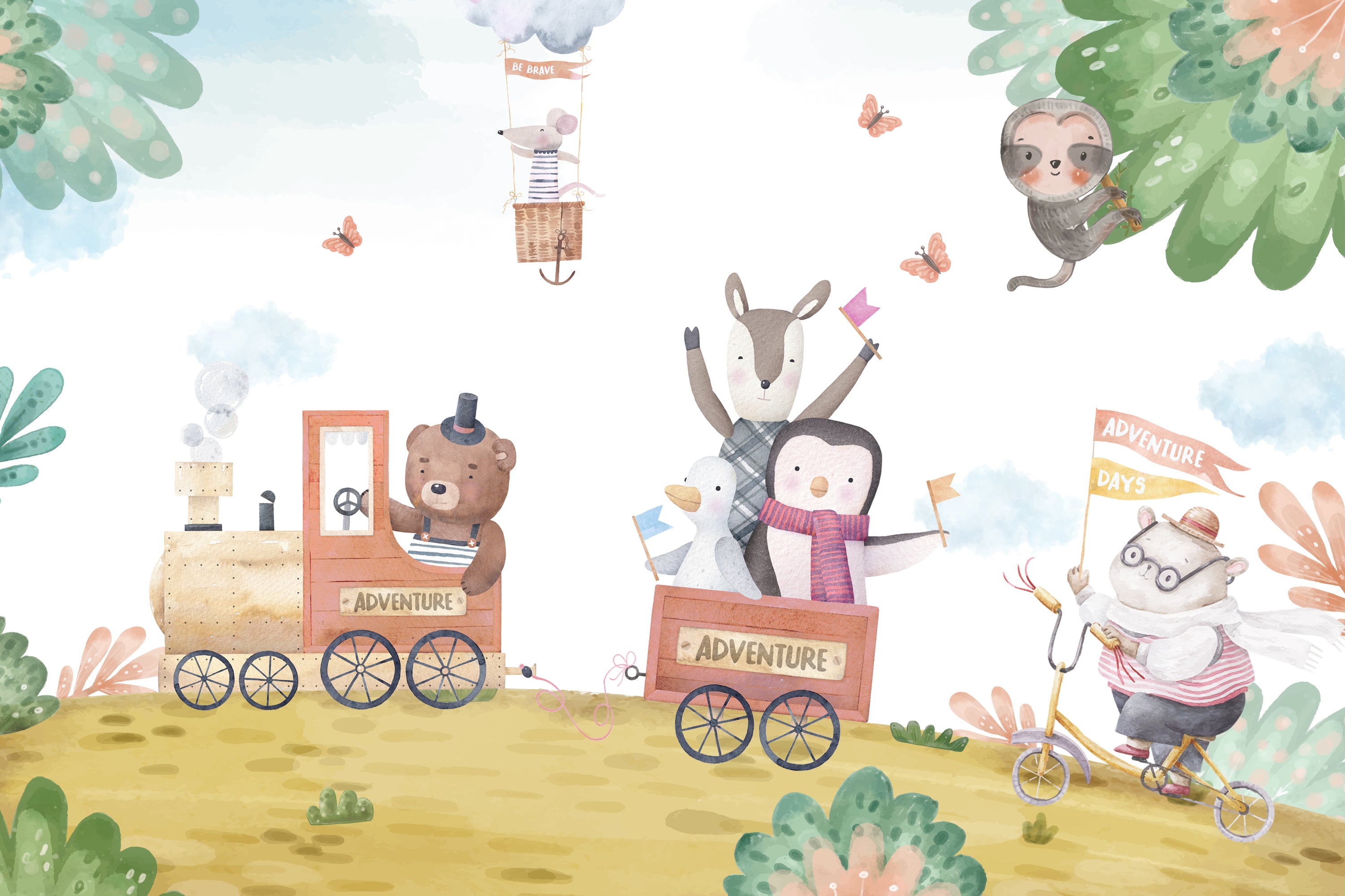 Charming wallpaper design featuring a train of animated animals in a countryside setting.