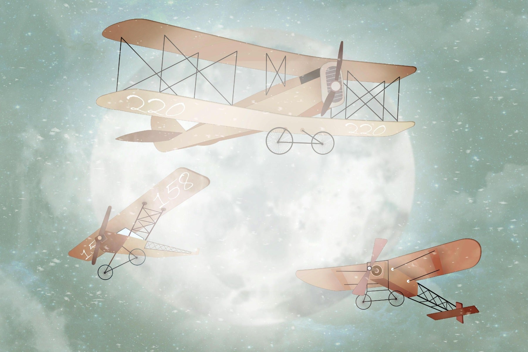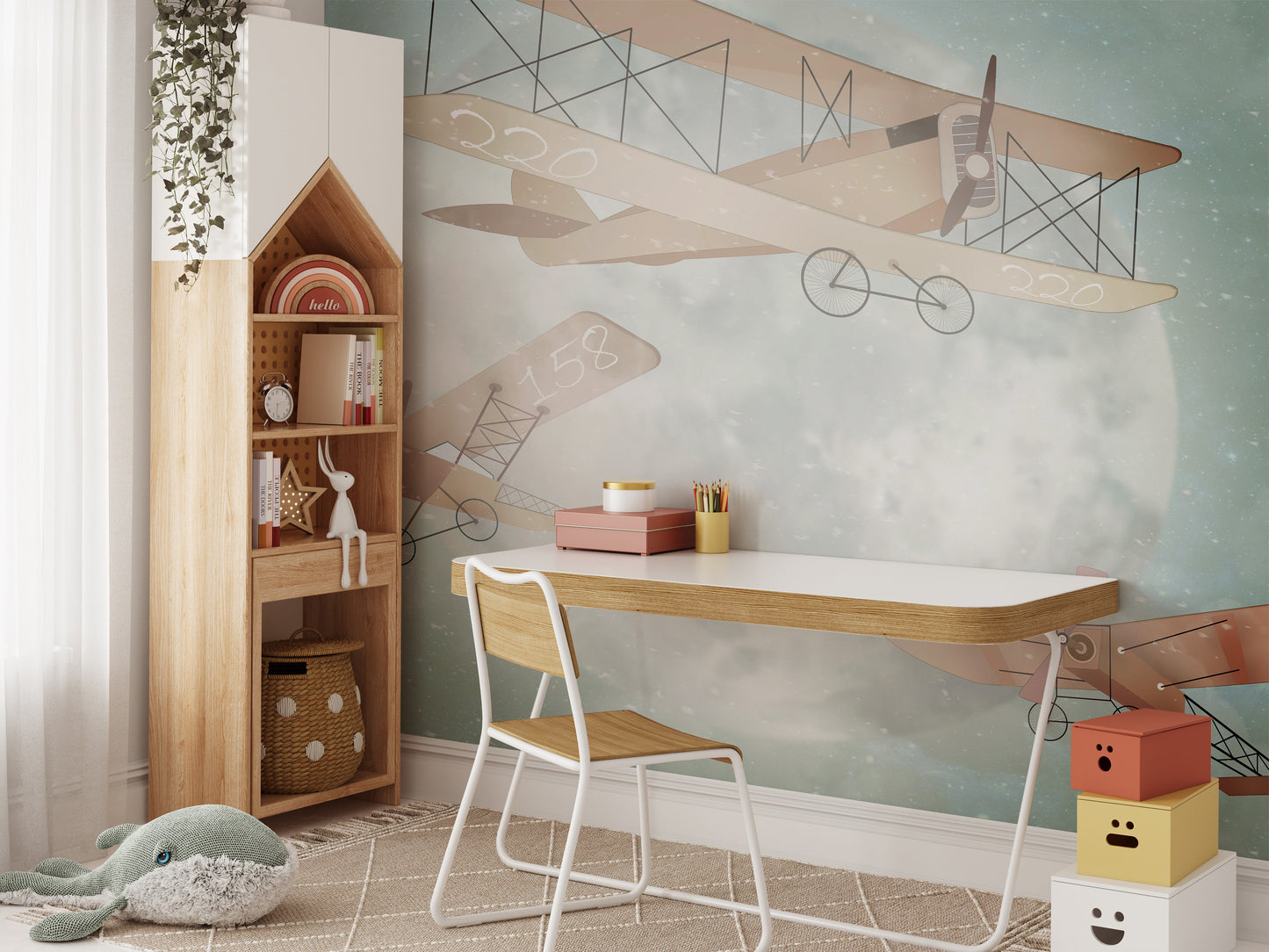 Brighten up your child's room using the cute animals aviators wall mural. This delightful wallpaper features jovial animals piloting vintage planes, cruising across a dreamy moonlit sky. The captivating design sparks imagination, turning the room into an aerial wonderland. Each glance at the playful kittens in their flying machines promises to inspire stories of adventure and whimsy, perfect for nurturing young minds. This kids wallpaper merges fun with fantasy for a truly magical space.