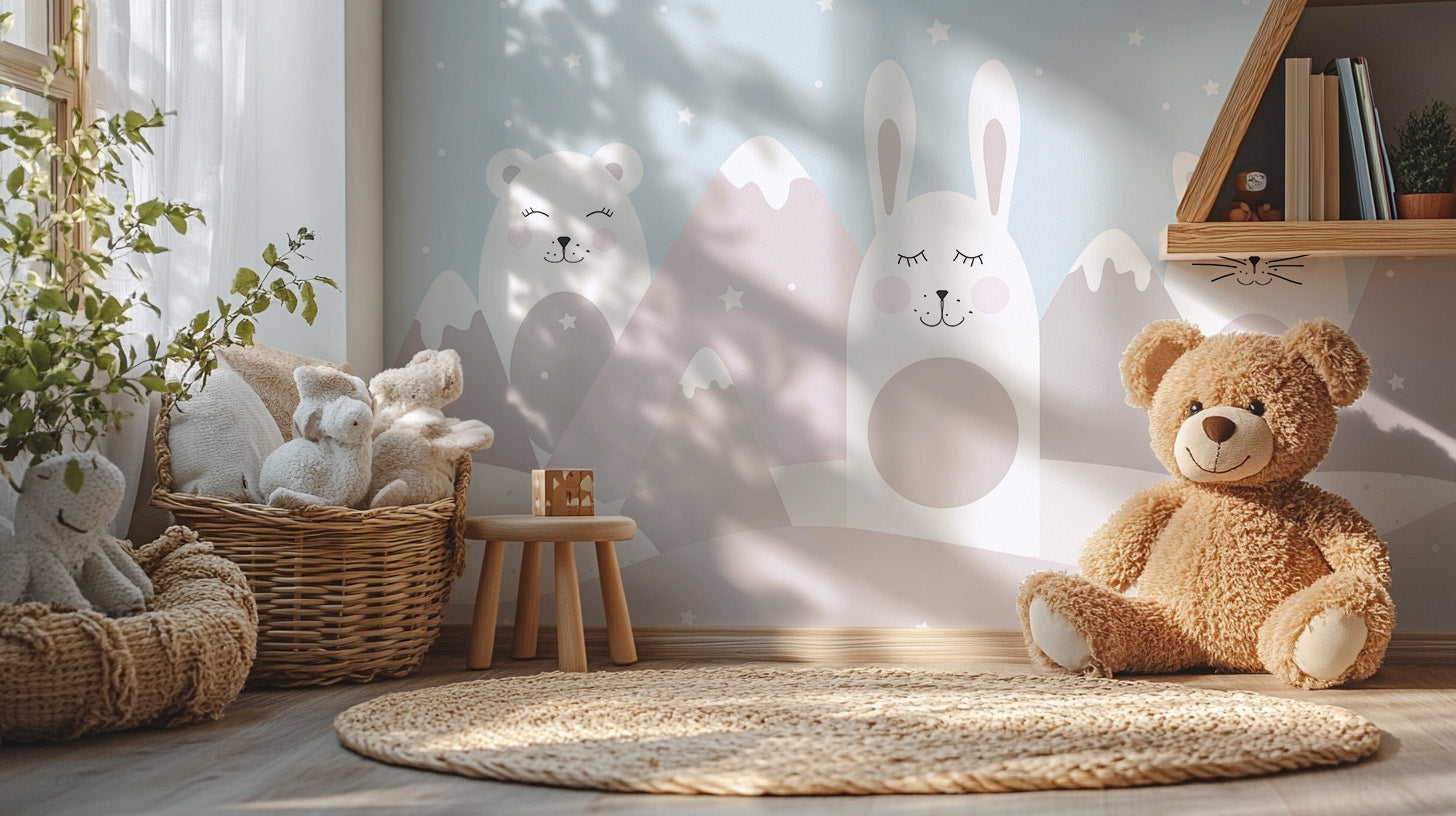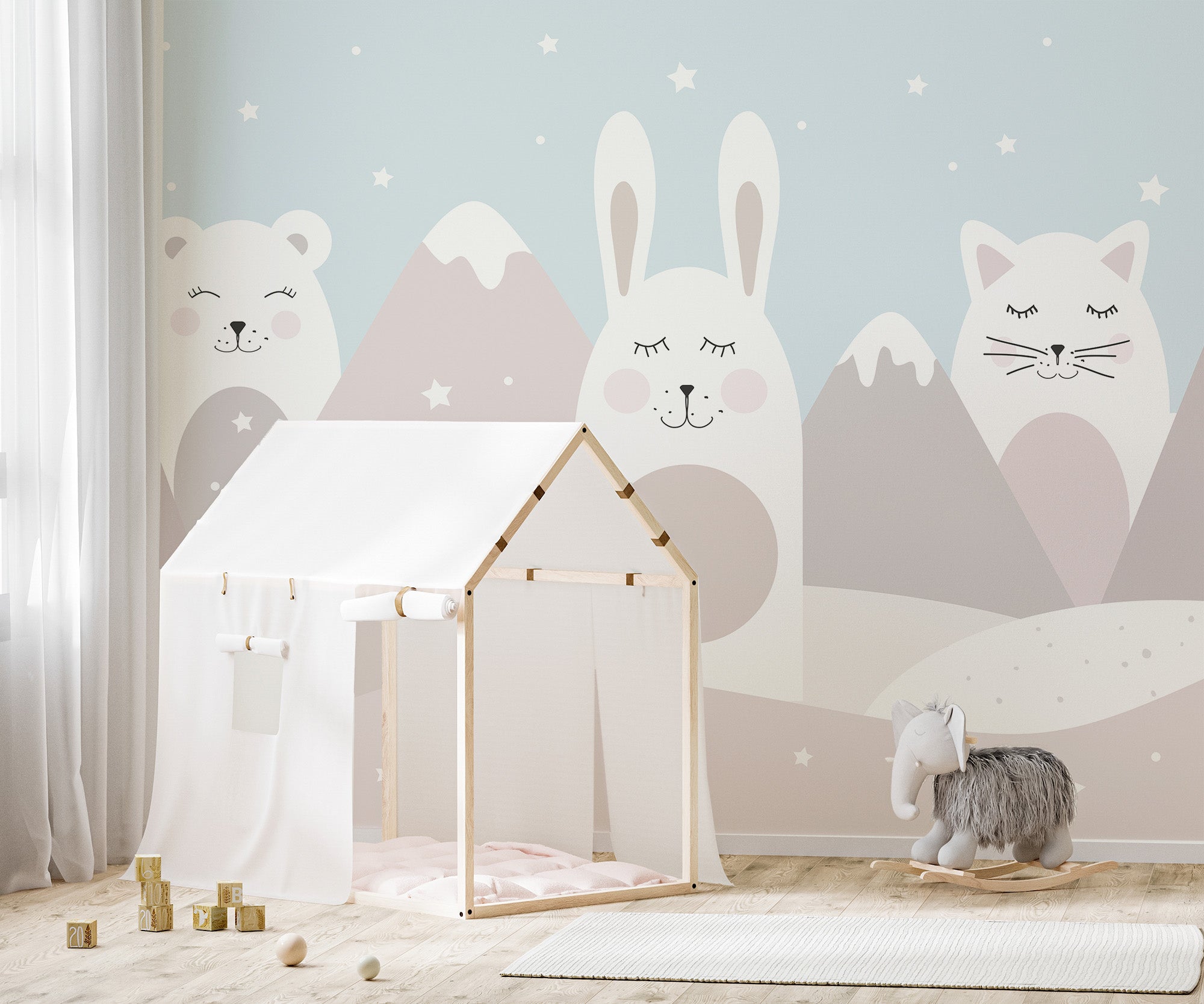 Brighten up your little one's bedroom with our cute animals kids bedroom wallpaper mural. This playful design features a whimsical animal trio nestled among serene peaks, creating a charming backdrop for story time. Our kids mountains wallpaper mural is crafted to inspire smiles and fuel imagination, making it a delightful addition to any young adventurer’s room as a kids bedroom wallpaper mural. It's an effortless way to add a splash of color and a dash of magic to your child's daily routine.