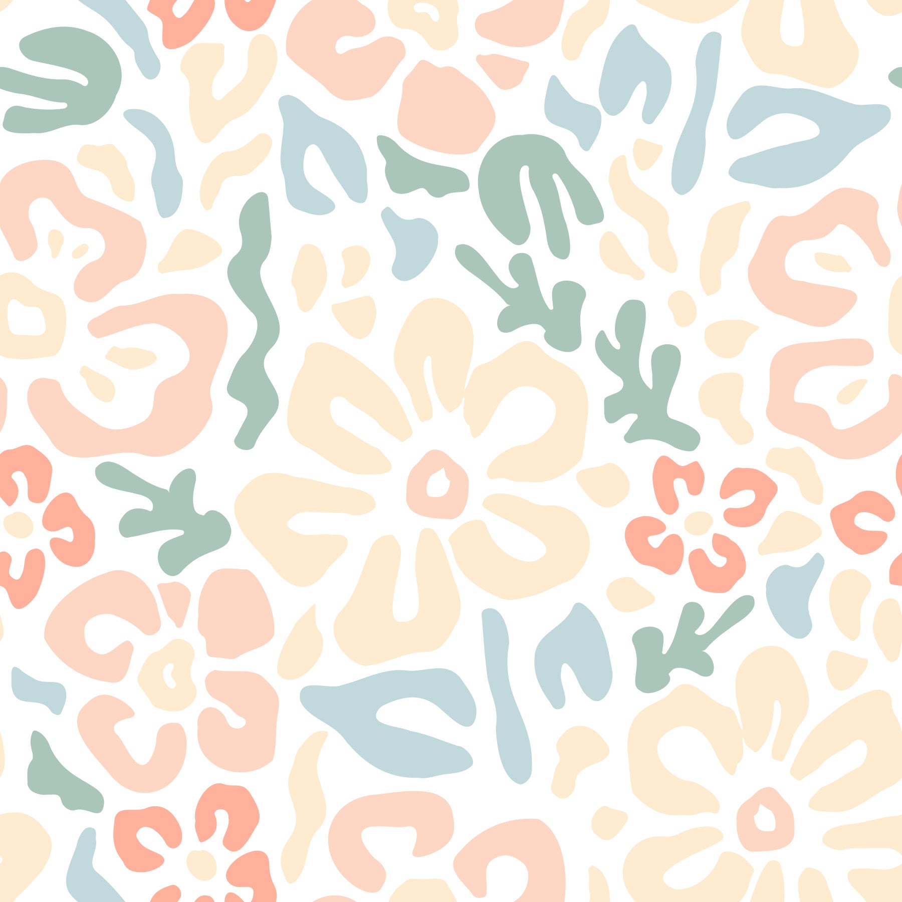Embrace the charm of simple forms with this abstract floral design. Soft hues of peach, beige, blue and green combine to craft a light and airy backdrop. The simplified shapes create a seamless pattern, perfect for adding a touch of whimsy. This wallpaper for walls brings a playful and cheerful mood to nurseries, kids rooms, or even a sunlit living room. Its relaxed style complements modern and bohemian interiors.