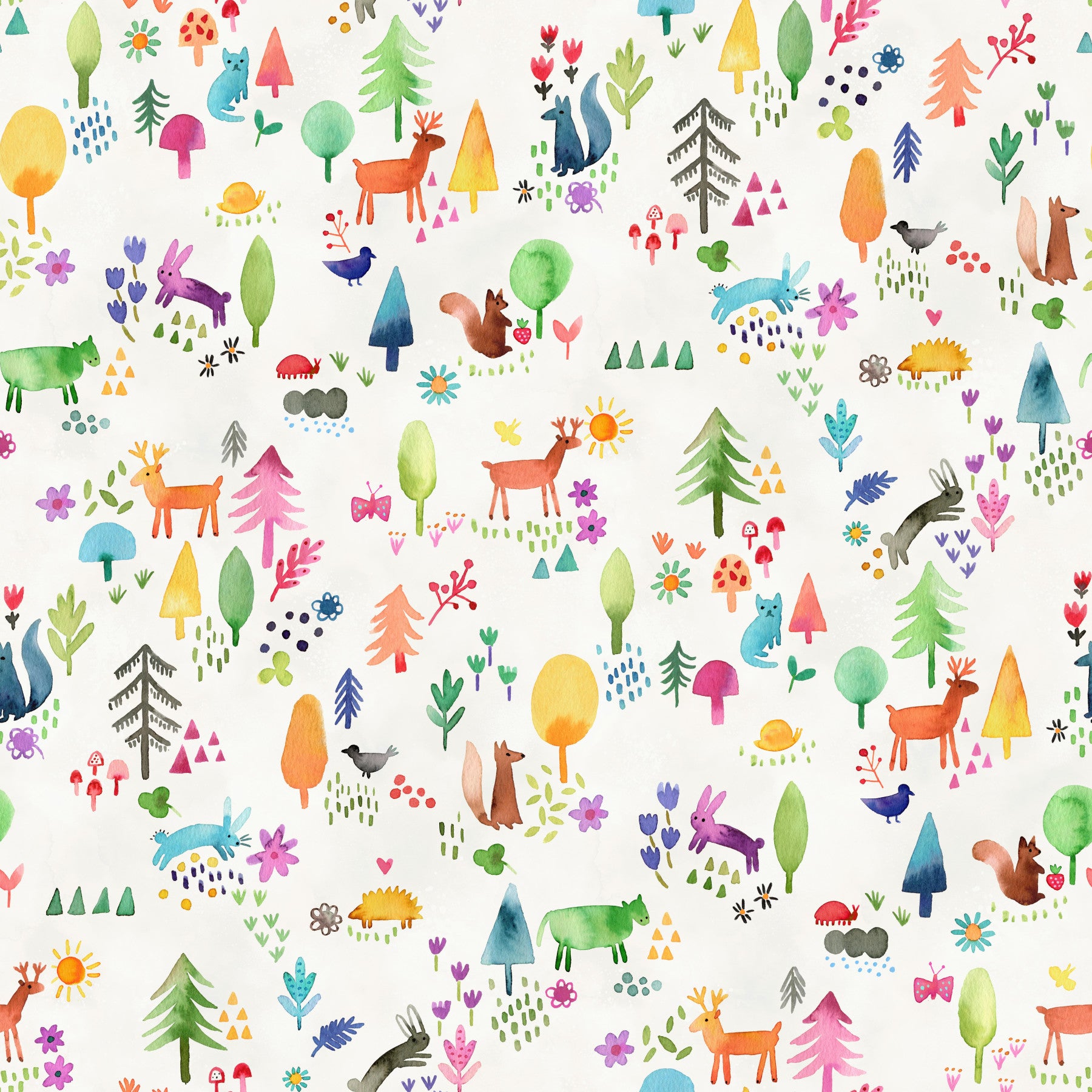 Embrace the whimsical charm of this watercolor wallpaper featuring adorable tiny forest animals! A delightful array of fox kits, playful deer, bunnies, and other woodland creatures frolic amidst a vibrant landscape of colorful trees, flowers, and mushrooms. The playful, hand-painted style creates a cheerful and inviting atmosphere, perfect for adding a touch of childish wonder to any digital device. Bright hues and simple shapes make this wallpaper both visually appealing and effortlessly endearing, bringing the magic of a miniature forest to your screen.