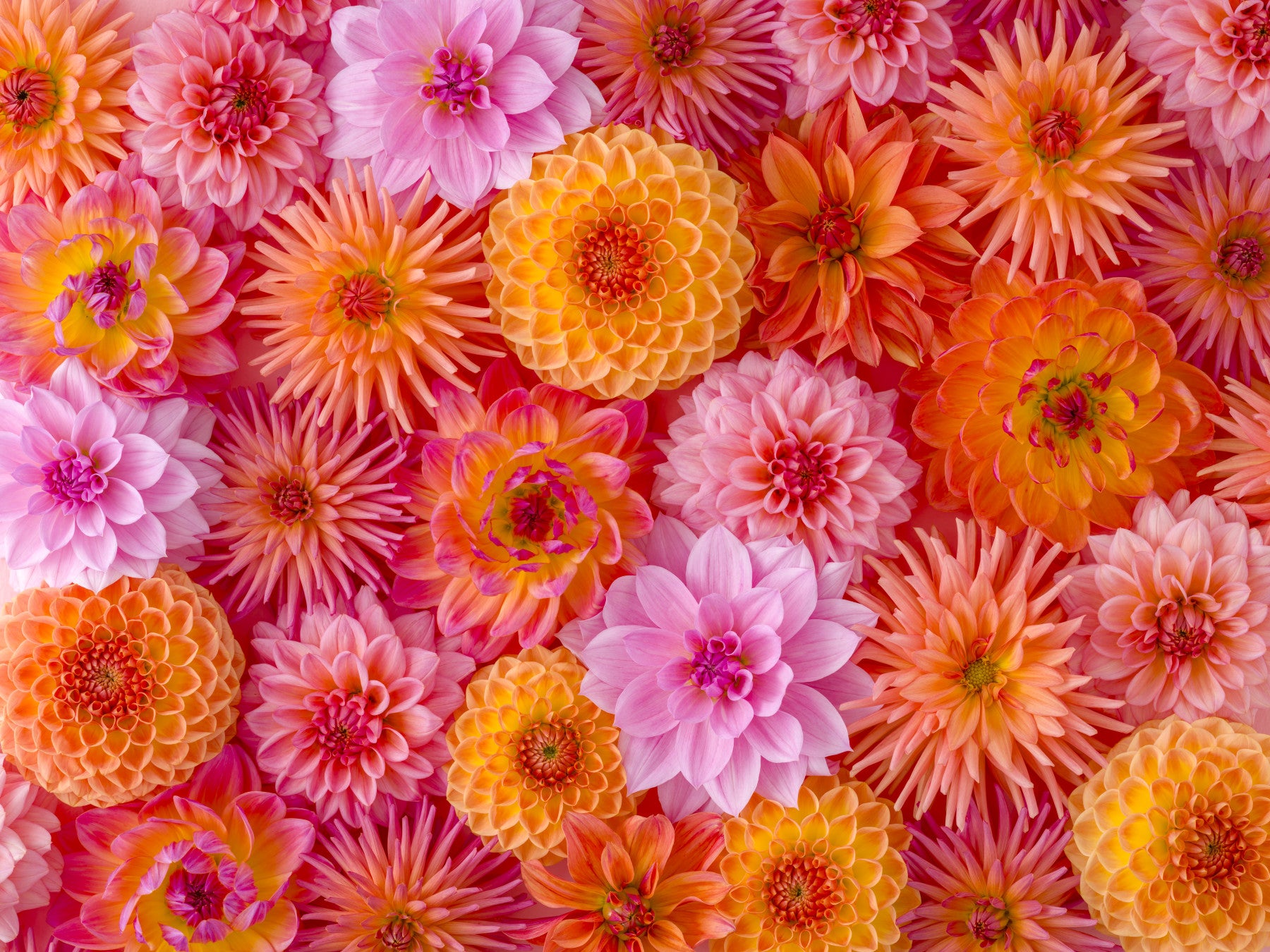 Immerse yourself in a vibrant tapestry of Dahlia blossoms. This wallpaper showcases a breathtaking array of coral, pink, and orange dahlias, meticulously arranged to create a seamless, captivating floral pattern. The rich, saturated colors evoke a sense of warmth, joy, and abundant beauty. Each dahlia's intricate details are sharply defined, making this wallpaper a stunning visual feast. The harmonious blend of colors creates a calming yet energetic mood, perfect for adding a touch of elegance and nature's artistry to any room.