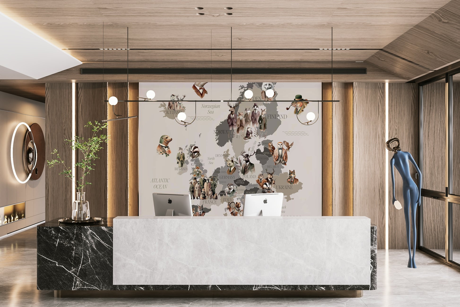 Animal dressed figures wall map design