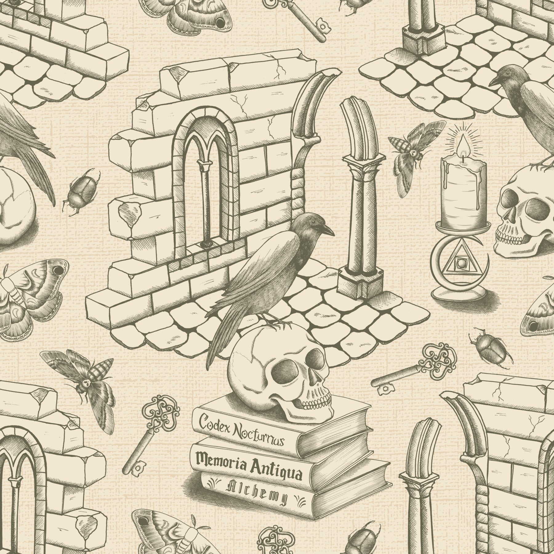 Immerse yourself in the mysterious allure of 'Dark Academia Toile de Jouie - Dark olive'. This wallpaper showcases a captivating dark olive and beige toile de jouie pattern, featuring intricate hand-drawn illustrations of gothic architecture, ancient books (inscribed with 'Codex Nocturnus', 'Memoria Antiqua', and 'Alchemy'), skulls, ravens, moths, and antique keys. The design evokes a sense of scholarly mystery and old-world charm, perfect for adding a touch of dark academia elegance to your digital space. The distressed texture of the background adds depth and a vintage feel, enhancing the overall enigmatic and sophisticated atmosphere.