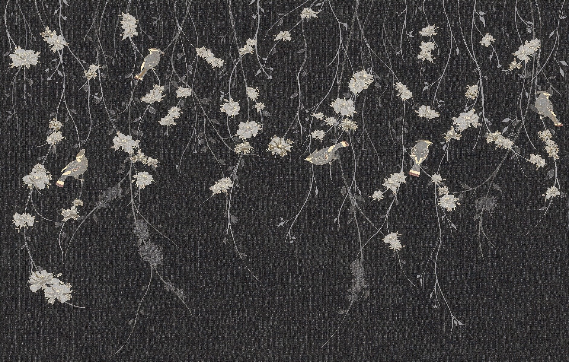 Beautiful Dark Black Flowers & Birds Wallpaper Mural